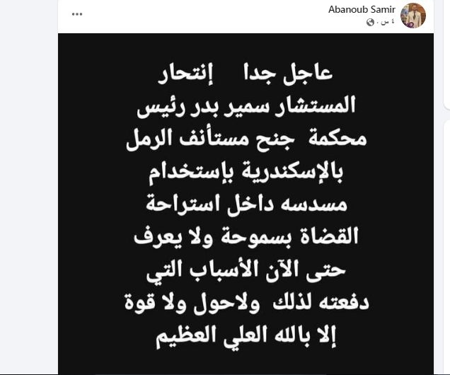 انتحار قاضي .. أثارت حادثة وفاة رئيس محكمة في الإسكندرية صدمة واسعة داخل أوساط القضاء والمجتمع القانوني، بعد أن نشر محامٍ معروف تفاصيل الواقعة على صفحته الخاصة، مؤكّدًا أن حتى الآن لا تتوافر معلومات مؤكدة عن أسباب الوفاة — وهو الخبر الذي أثار جدلاً واسعًا وسط دعوات للشفافية ومعرفة الحقيقة كاملة. والتحقيقات لا تزال مستمرة، والأجهزة المختصة لم تكشف بعد ما دفع القاضي لاتخاذ هذه الخطوة، في ظل حرص على إعلاء مبدأ السرية لحين انتهاء إجراءات الفحص.