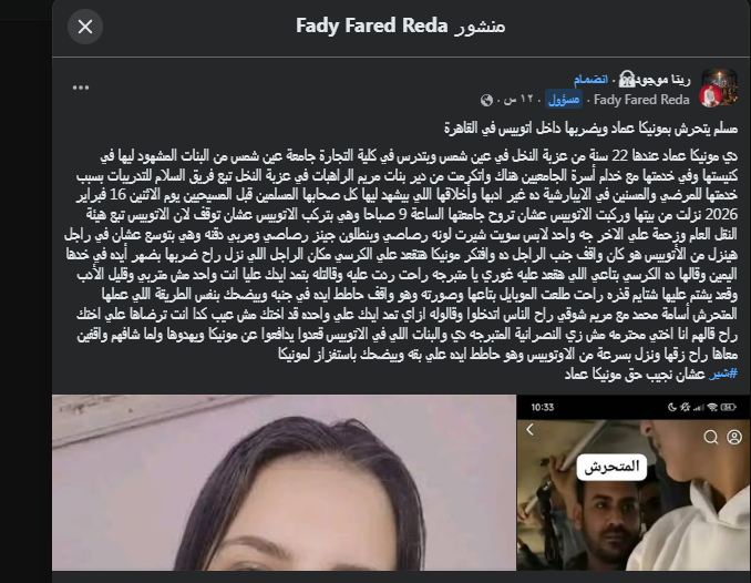 مونيكا عماد كانت في طريقها إلى جامعتها صباح الاثنين، حين تحولت رحلتها اليومية داخل أتوبيس تابع لهيئة النقل العام في القاهرة إلى واقعة مؤسفة أثارت غضب الركاب وتفاعلًا واسعًا على مواقع التواصل الاجتماعي.