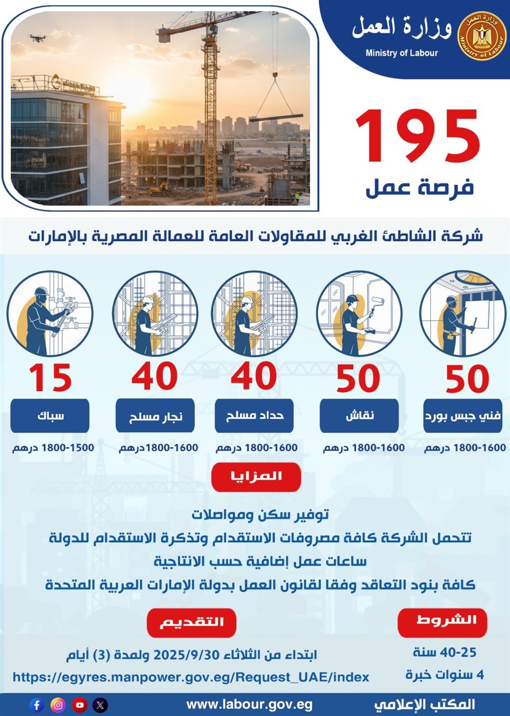 وبحسب الإعلان الرسمي ، اتاحت وزارة العمل توفير 195 فرصة عمل جديدة في دولة الإمارات العربية المتحدة، وذلك بالتعاون مع شركة "الشاطئ الغربي للمقاولات العامة"، ضمن خطة الوزارة لتوسيع فرص التشغيل الخارجي وفتح مجالات عمل نوعية أمام العمالة المصرية.