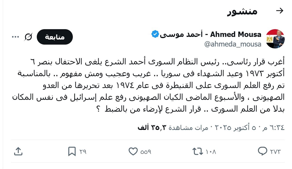 في تغريدة عبر حسابه على منصة "إكس"، وصف أحمد موسى القرار بأنه "غريب وغير مفهوم"، متسائلًا عن الجهات التي يسعى أحمد الشرع لإرضائها. وأكد موسى أن إلغاء عطلة 6 أكتوبر وعيد الشهداء يتناقض مع رمزية هذه المناسبات التي تُعد جزءًا من الوجدان العربي.