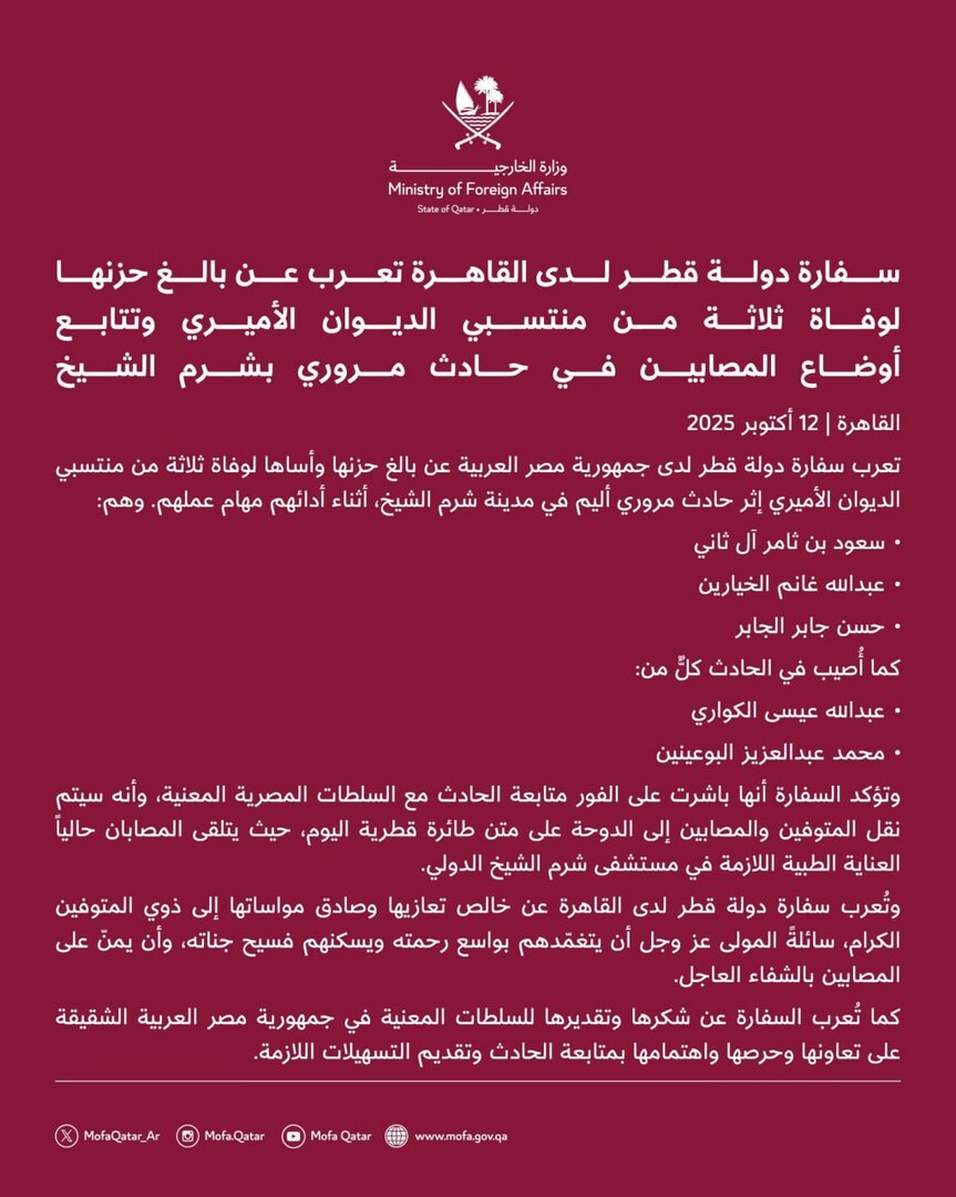 الوفد القطري ,, أعلنت سفارة دولة قطر في القاهرة عن متابعة مستمرة للحادث المروري المأساوي الذي وقع مساء السبت على طريق شرم الشيخ-طور سيناء، وأسفر عن وفاة ثلاثة من موظفي الديوان الأميري ضمن الوفد القطري أثناء تأديتهم لمهام رسمية في مصر. وأكدت السفارة أن جثامين الضحايا سيتم نقلها إلى قطر اليوم، فيما يتلقى المصابون الرعاية الطبية اللازمة بمستشفى شرم الشيخ الدولي.