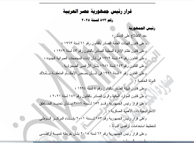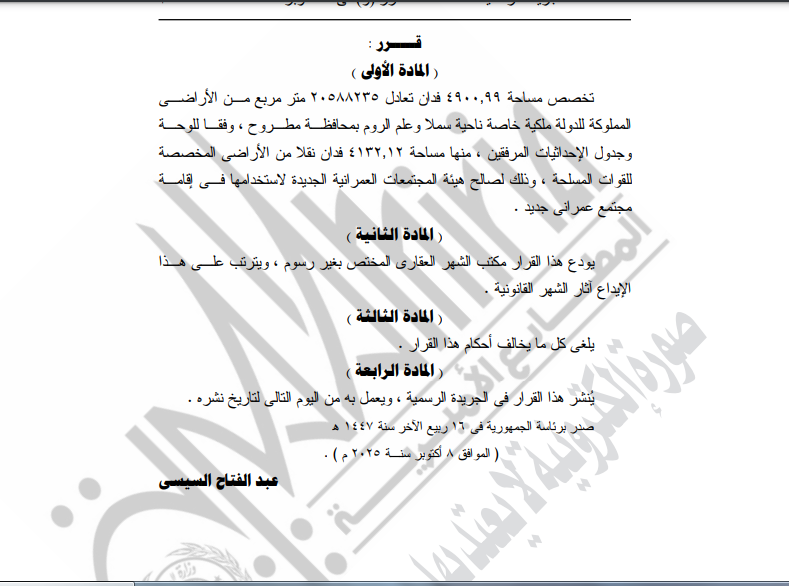 تفاصيل القرار الجمهوري المنشور في الجريدة الرسمية حول تخصيص الأراضي لإقامة مجتمعات عمرانية جديدة بمطروح
