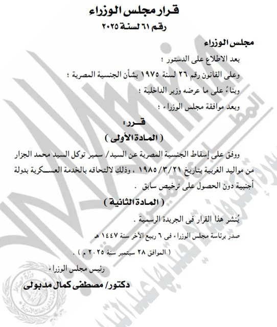 أصدر مجلس الوزراء برئاسة الدكتور مصطفى مدبولي، قرارًا رسميًا يقضي بإسقاط الجنسية المصرية عن المواطن سمير توكل السيد محمد الجزار، المولود بمحافظة الغربية في 21 مارس 1985، بعد ثبوت التحاقه بالخدمة العسكرية في إحدى الدول الأجنبية دون الحصول على الموافقات القانونية المطلوبة من الجهات المصرية المختصة.