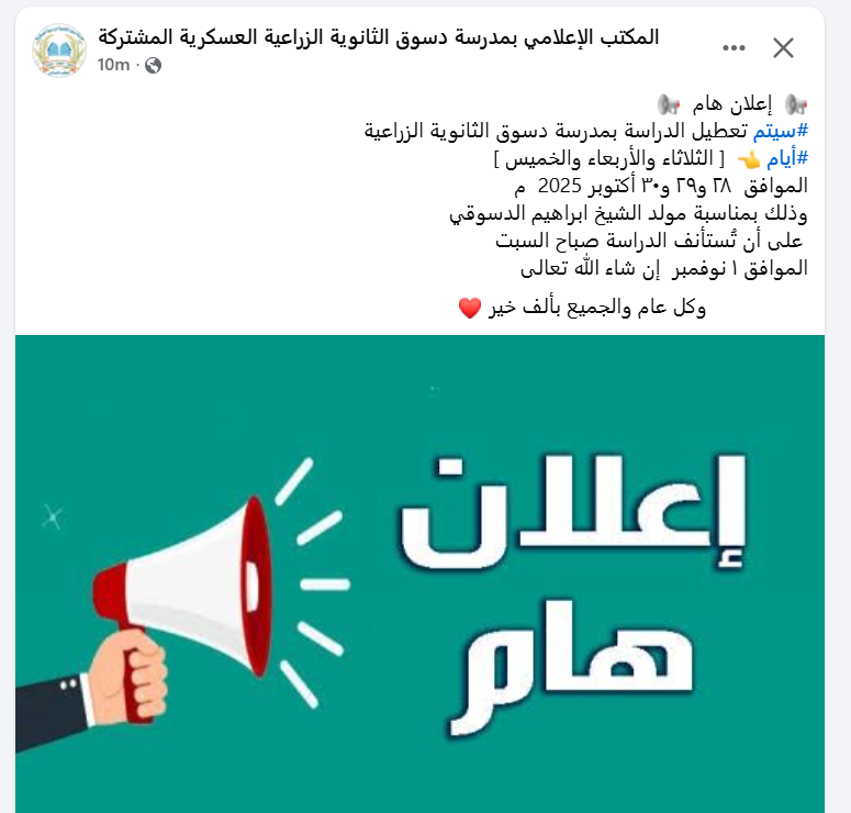 تعطيل الدراسة أثار اهتمامًا واسعًا بين أولياء الأمور والطلاب بمحافظة كفر الشيخ، بعد إعلان مدرسة دسوق الثانوية الزراعية رسميًا عبر صفحتها على "فيس بوك" عن وقف الدراسة لمدة 3 أيام متتالية بمناسبة مولد الشيخ إبراهيم الدسوقي، أحد أهم المناسبات الدينية في المحافظة. وأكدت المدرسة أن الدراسة ستُستأنف بشكل طبيعي يوم السبت الموافق 1 نوفمبر 2025.
