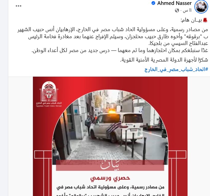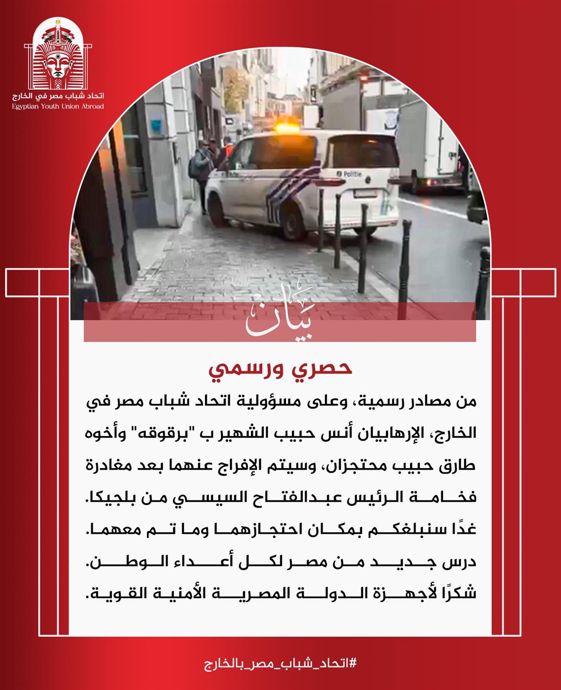 وأوضح “ناصر” أن المعلومة مؤكدة من مصادر رسمية، وعلى مسؤولية اتحاد شباب مصر في الخارج، مشيراً إلى أن الأجهزة الأمنية البلجيكية ألقت القبض على المتهمين عقب تداول المقطع المصور الذي اعتبر تهديداً أمنياً واضحاً، فيما جرى التعامل معه بسرعة من قِبل السلطات.
