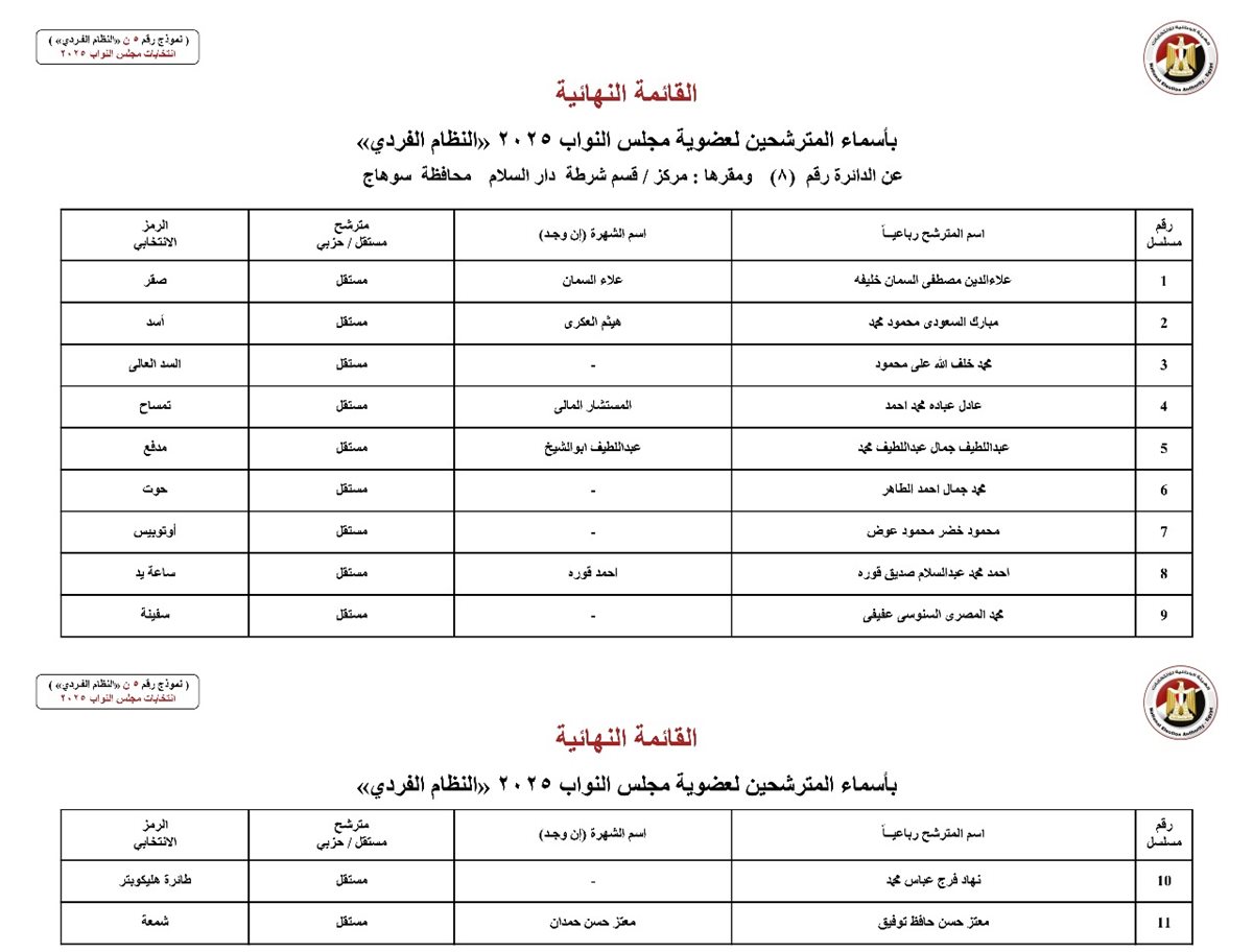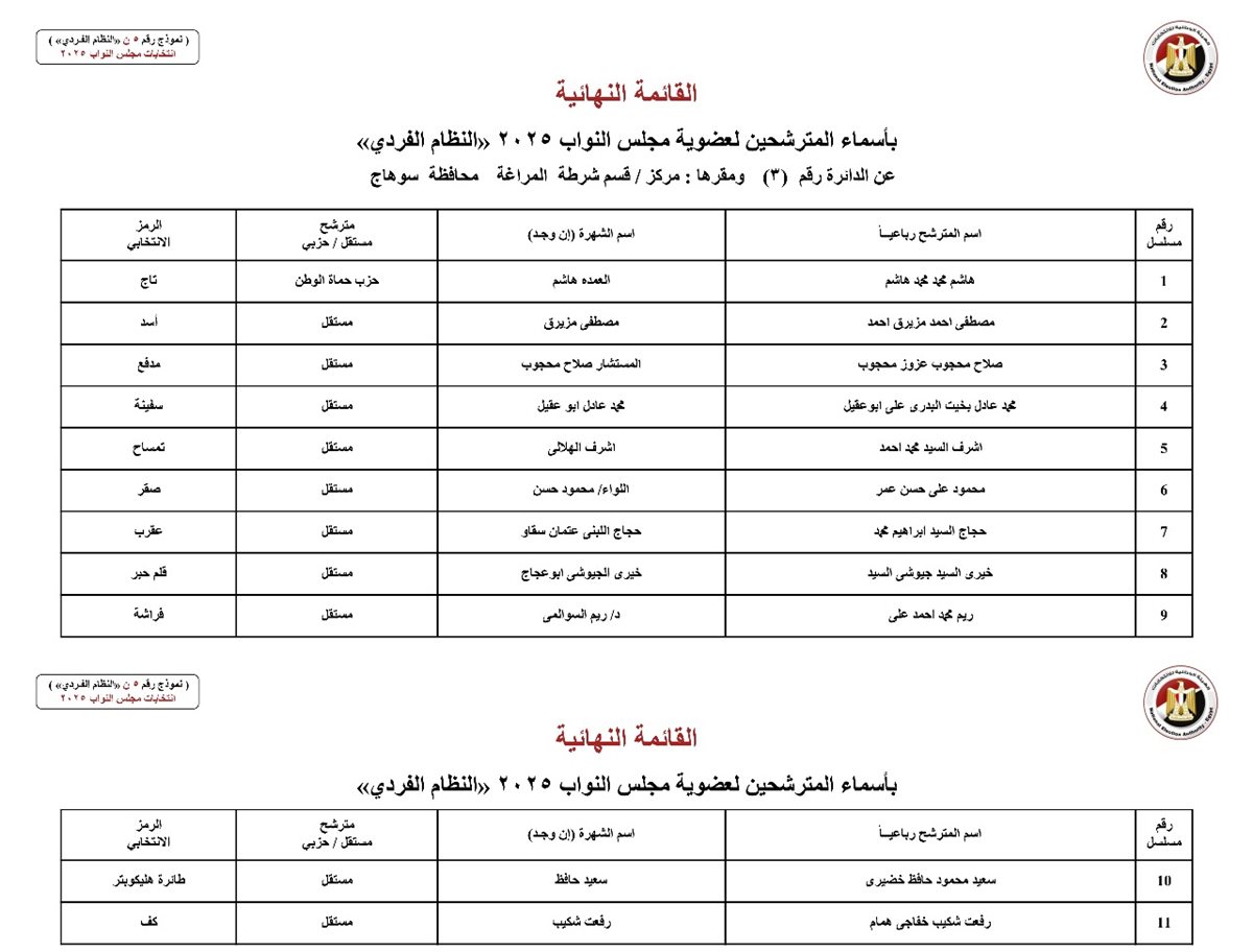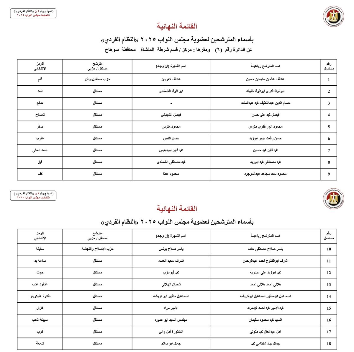 كما أعلنت الهيئة الوطنية للانتخابات أسماء المرشحين على النظام الفردي في محافظة سوهاج، موضحة أن المنافسة تشهد زخماً كبيراً بين المرشحين في الدوائر المختلفة، استعداداً لخوض انتخابات البرلمان 2025 وسط متابعة دقيقة من الجهات المعنية لضمان سير العملية الانتخابية بشفافية ونزاهة.