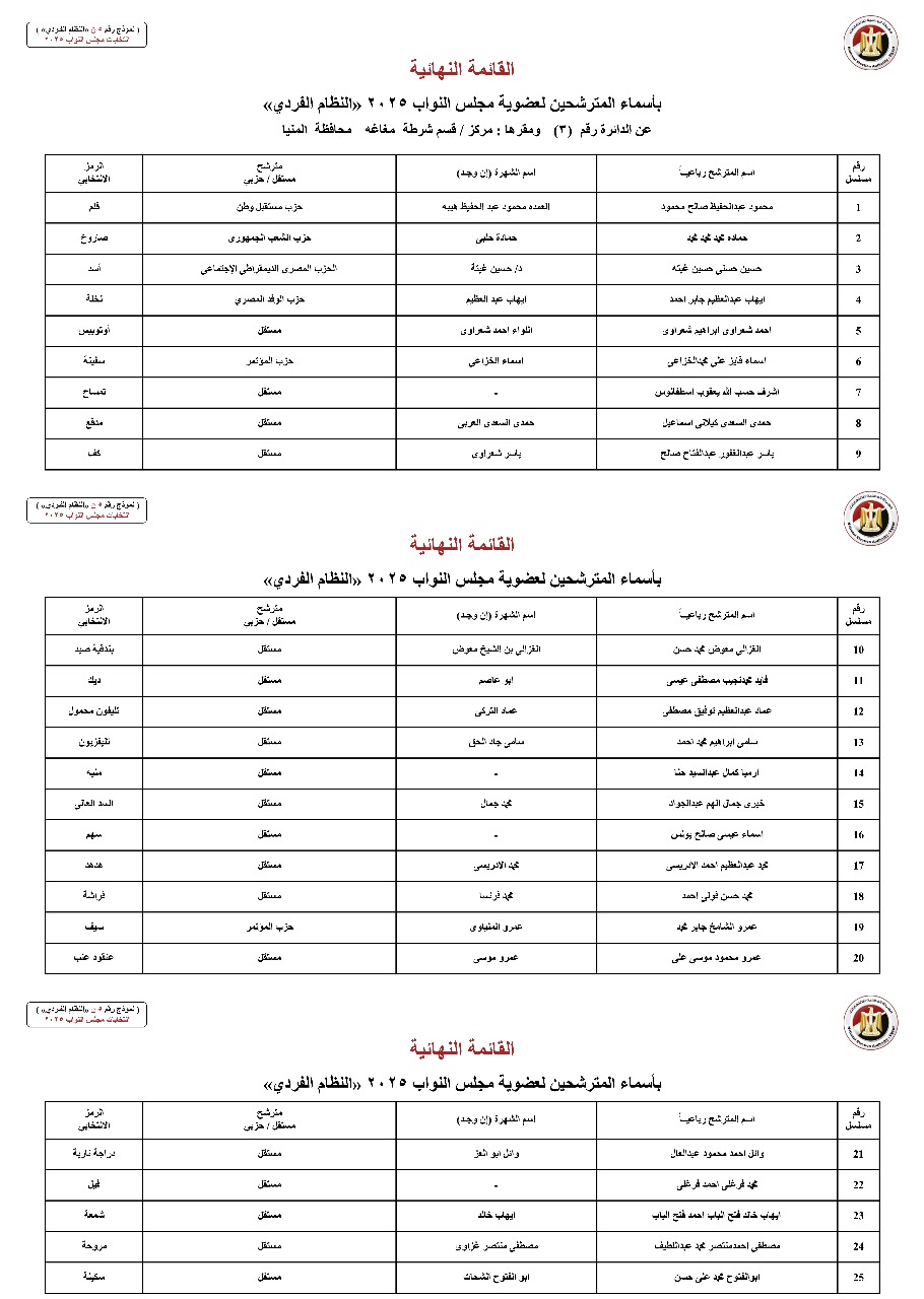 وفي محافظة المنيا، كشفت الهيئة الوطنية للانتخابات برئاسة المستشار حازم بدوي، منذ قليل، عن القوائم النهائية للمرشحين على النظام الفردي في انتخابات البرلمان 2025، مشيرة إلى أن إعلان الأسماء جاء عقب انتهاء فترة الطعون والفصل فيها أمام الجهات القضائية المختصة.