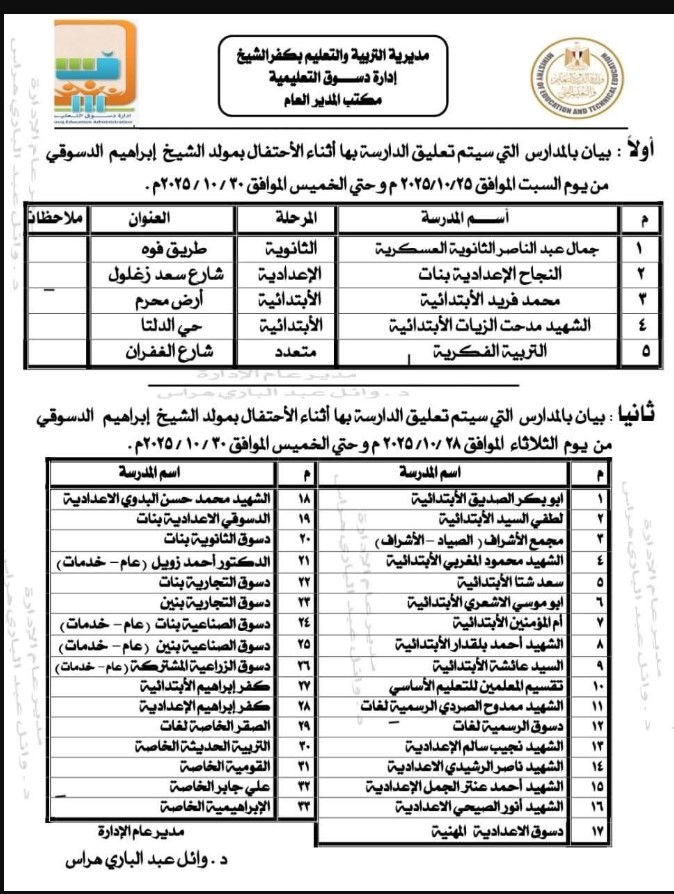 شمل القرار تعطيل الدراسة بشكل كامل في 5 مدارس بمدينة دسوق لمدة 6 أيام متواصلة، تبدأ من السبت 25 أكتوبر وحتى الخميس 30 أكتوبر، وهي المدارس الأقرب إلى ساحات ومساجد الاحتفال بمولد العارف بالله إبراهيم الدسوقي.