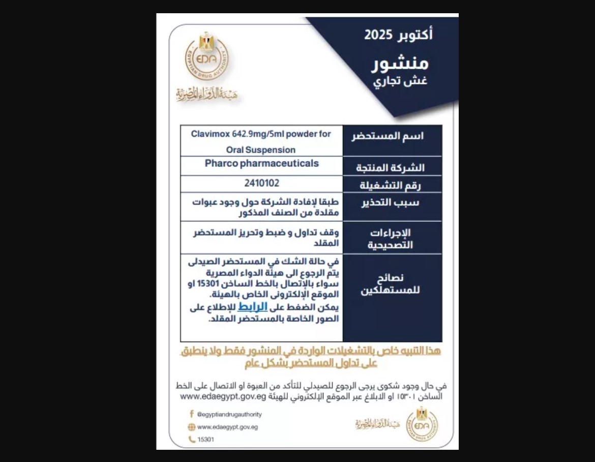 أصدرت هيئة الدواء المصرية منشورًا رسميًا يحمل رقم (74 لسنة 2025)، حذرت فيه من تداول مضاد حيوي مغشوش منتشر بالأسواق، مؤكدة أن هذا المنتج يمثل خطرًا مباشرًا على صحة المواطنين.
