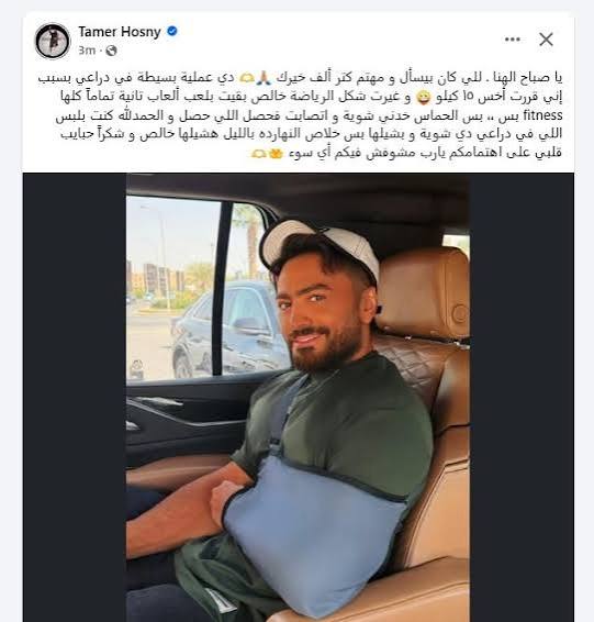وقال تامر حسني مازحًا: “الحماس خدني شوية، وأصبت في ذراعي، فحصل اللي حصل”، في إشارة إلى أنه كان متحمسًا لخوض تجربة جديدة في التمارين الرياضية، لكن الحماس الزائد تسبب في إصابة مفاجئة استدعت التدخل الجراحي.