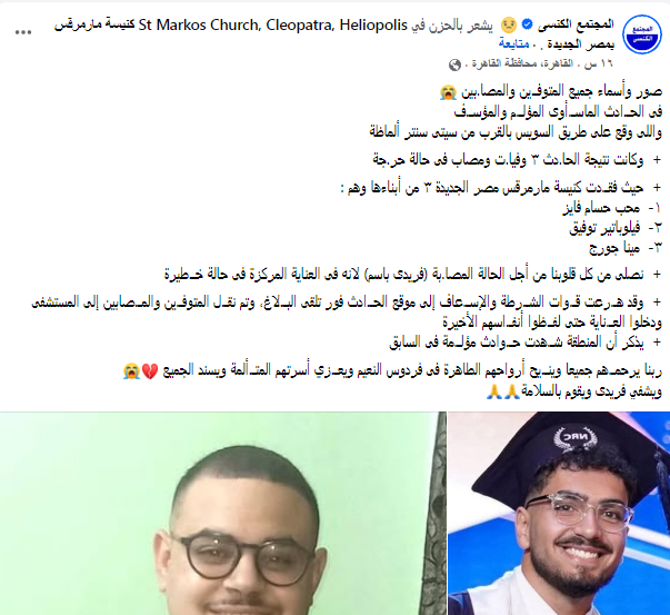 فقدت كنيسة مار مرقس بمنطقة كليوباترا في مصر الجديدة ثلاثة من خدامها الشباب في حادث سير مروع وقع بطريق السويس، بالقرب من سيتي سنتر ألماظة، مما خلف حالة من الحزن العميق بين أبناء الكنيسة وأسر الضحايا.