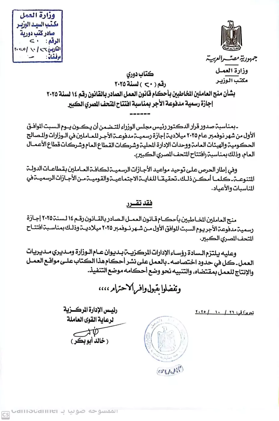 أعلنت وزارة العمل عن إصدار الكتاب الدوري رقم (20) لسنة 2025 الموجه إلى جميع مديريات العمل بالمحافظات بشأن تطبيق قرار الإجازة الرسمية يوم 1 نوفمبر 2025.
