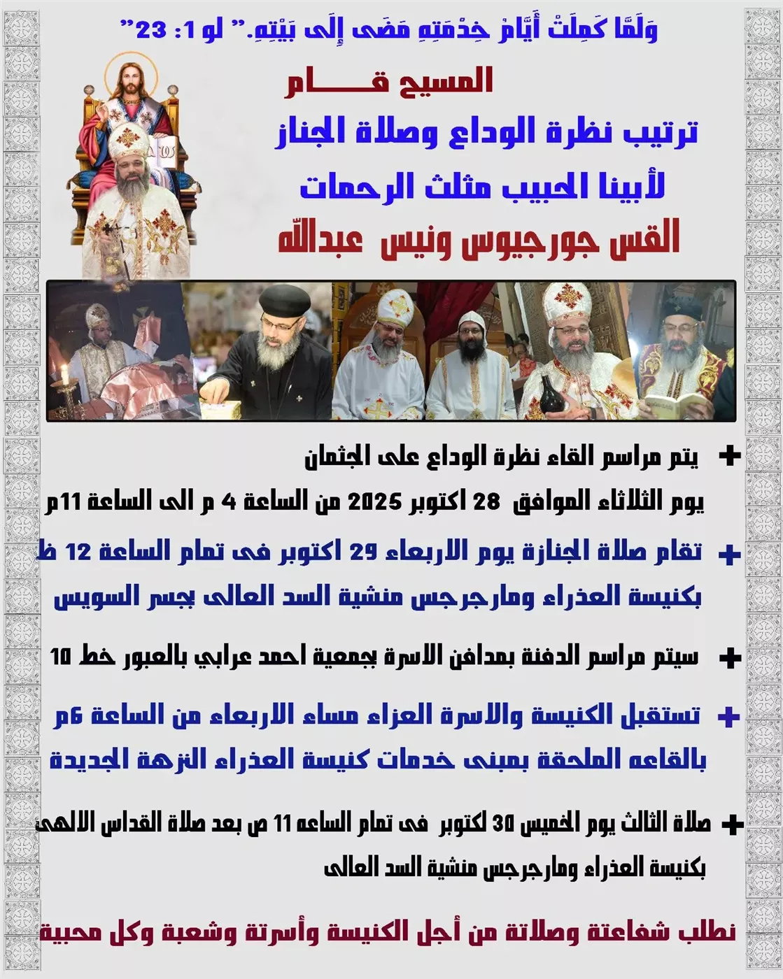 ترتيبات صلاة جنازة القس جورجيوس ونيس