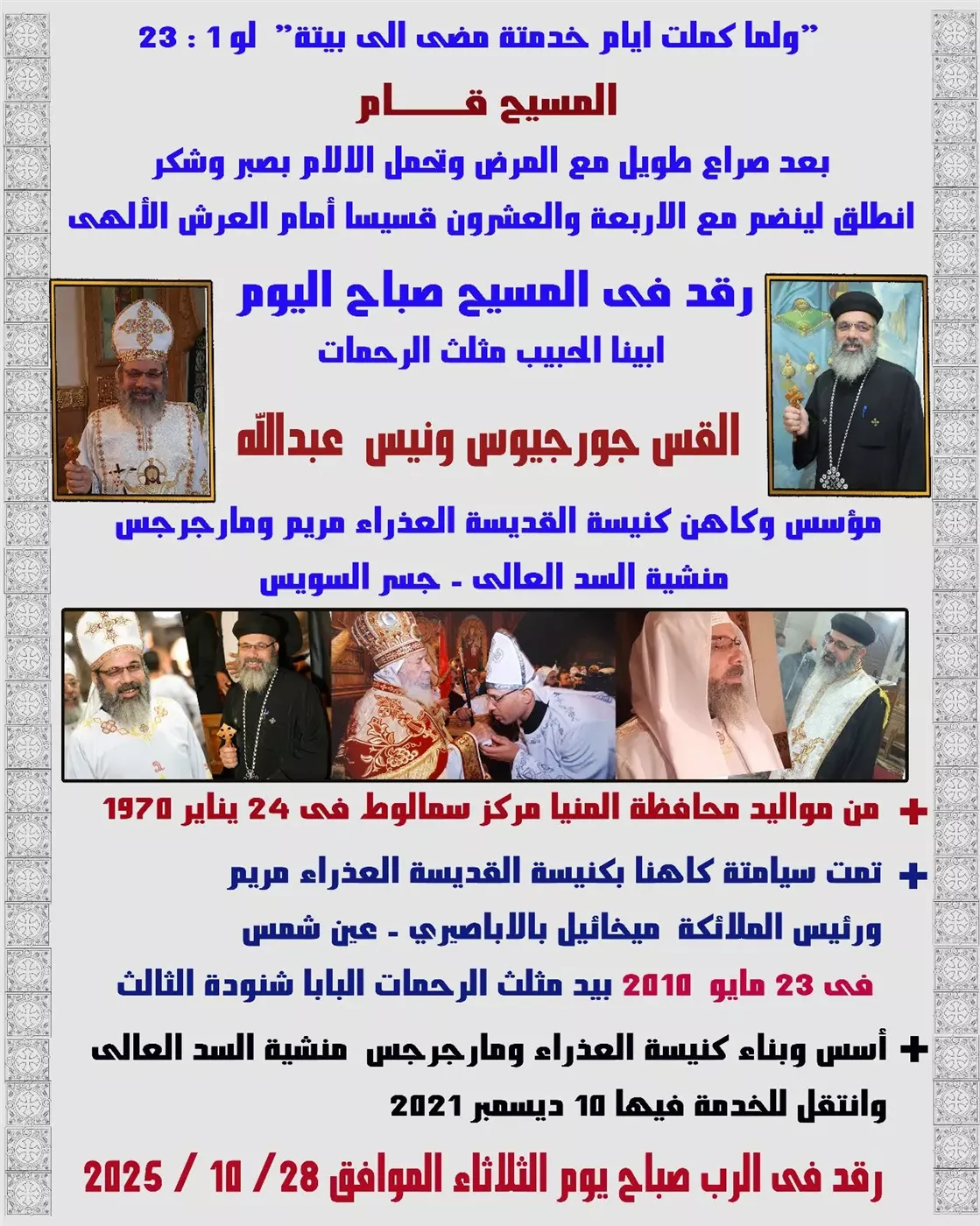 نياحة القس جورجيوس ونيس .. في مشهد يملأ القلوب بالحزن والإيمان في آن واحد، رحل إلى السماء القس جورجيوس ونيس، راعي كنيسة العذراء ومارجرجس، بعد صراع طويل مع المرض، ليكمل رحلته الروحية في الفردوس، حيث الراحة الأبدية والمجد السماوي. كانت نياحة القس جورجيوس ونيس لحظة مؤثرة لكل من عرفه وخدم معه، إذ عرف بمحبة فائقة، وإخلاص نادر في خدمته ورعايته لشعبه وكنيسته.