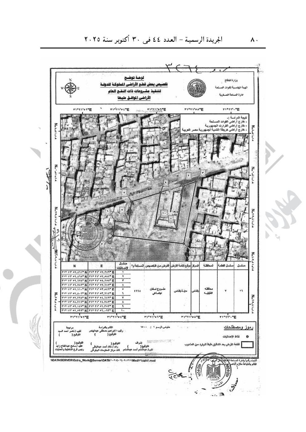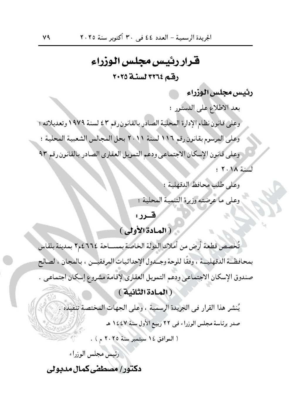 - فقد نص القرار الأول رقم 3264 لسنة 2025 على تخصيص قطعة أرض من أملاك الدولة الخاصة بمدينة بلقاس بمحافظة الدقهلية، تبلغ مساحتها 4664 مترًا مربعًا، لصالح صندوق الإسكان الاجتماعي ودعم التمويل العقاري لإقامة مشروع سكني جديد بالمجان.