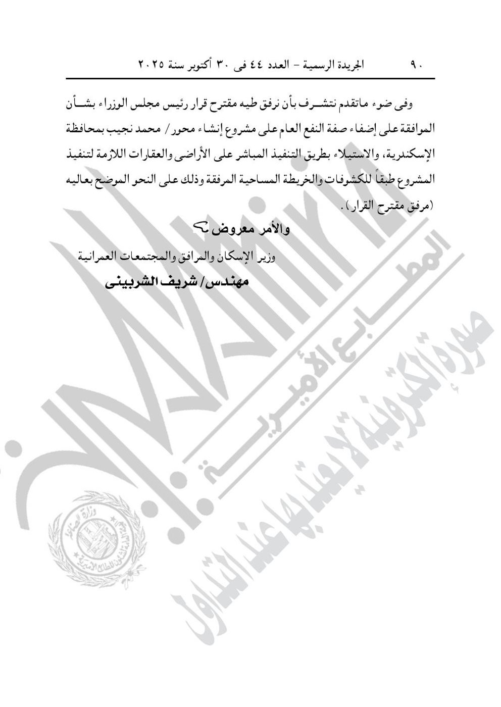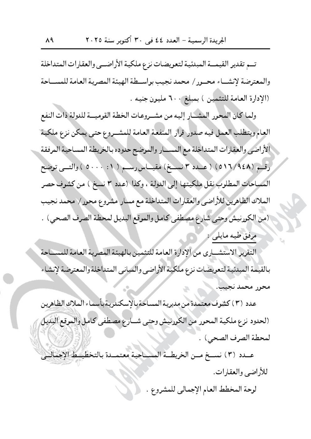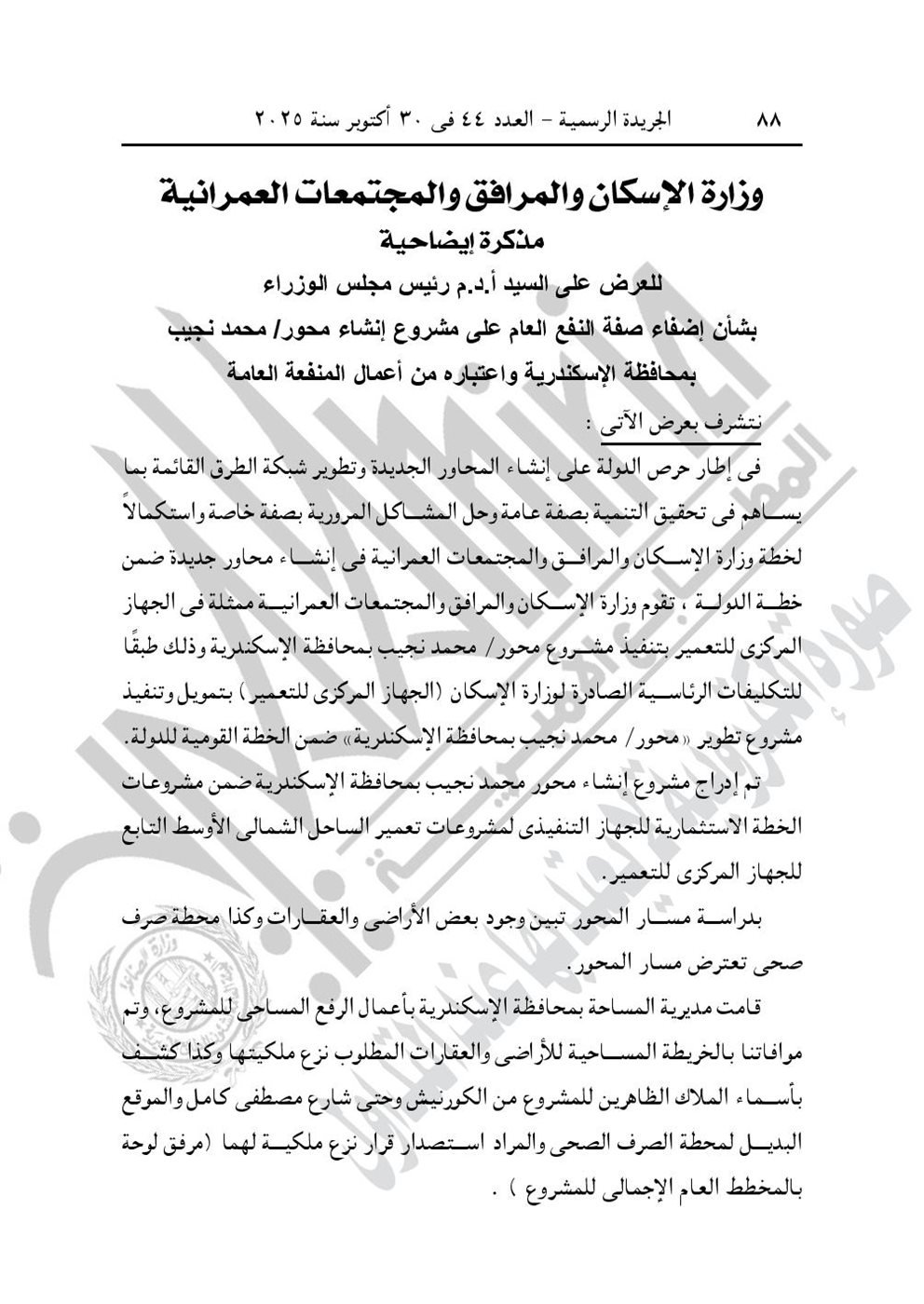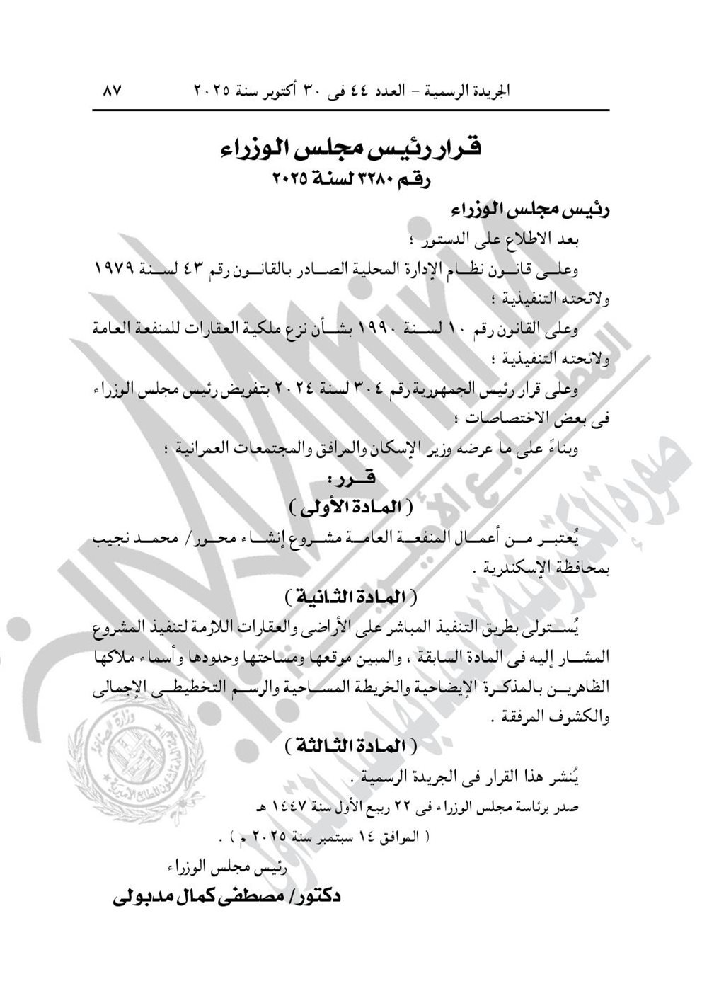 - بينما نص القرار الخامس رقم 3280 لسنة 2025 على اعتبار مشروع محور محمد نجيب بمحافظة الإسكندرية من أعمال المنفعة العامة، مع الاستيلاء على الأراضي والعقارات اللازمة لتنفيذه بطريق التنفيذ المباشر.