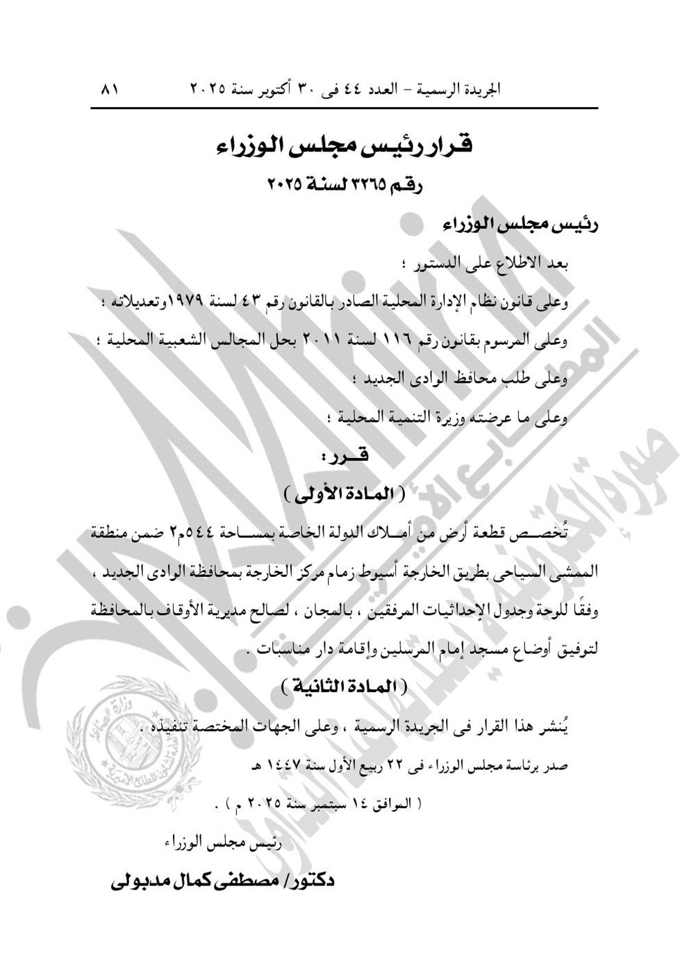 - أما القرار الثاني رقم 3265 لسنة 2025، فتضمن تخصيص قطعة أرض بمساحة 544 مترًا مربعًا ضمن الممشى السياحي بطريق الخارجة–أسيوط بمحافظة الوادي الجديد، لصالح مديرية الأوقاف لتوفيق أوضاع مسجد إمام المرسلين وإنشاء دار مناسبات تابعة له.