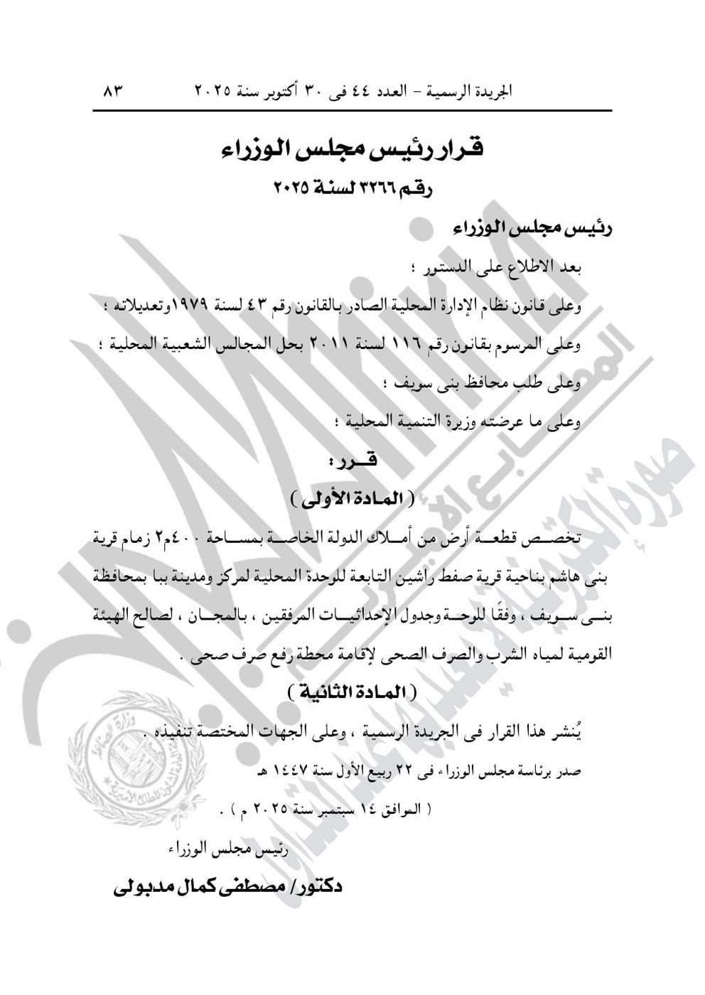 - وجاء القرار الثالث رقم 3266 لسنة 2025 لتخصيص مساحة 400 متر مربع بقرية بني هاشم في مركز ببا بمحافظة بني سويف لصالح الهيئة القومية لمياه الشرب والصرف الصحي من أجل إنشاء محطة رفع صرف صحي جديدة.