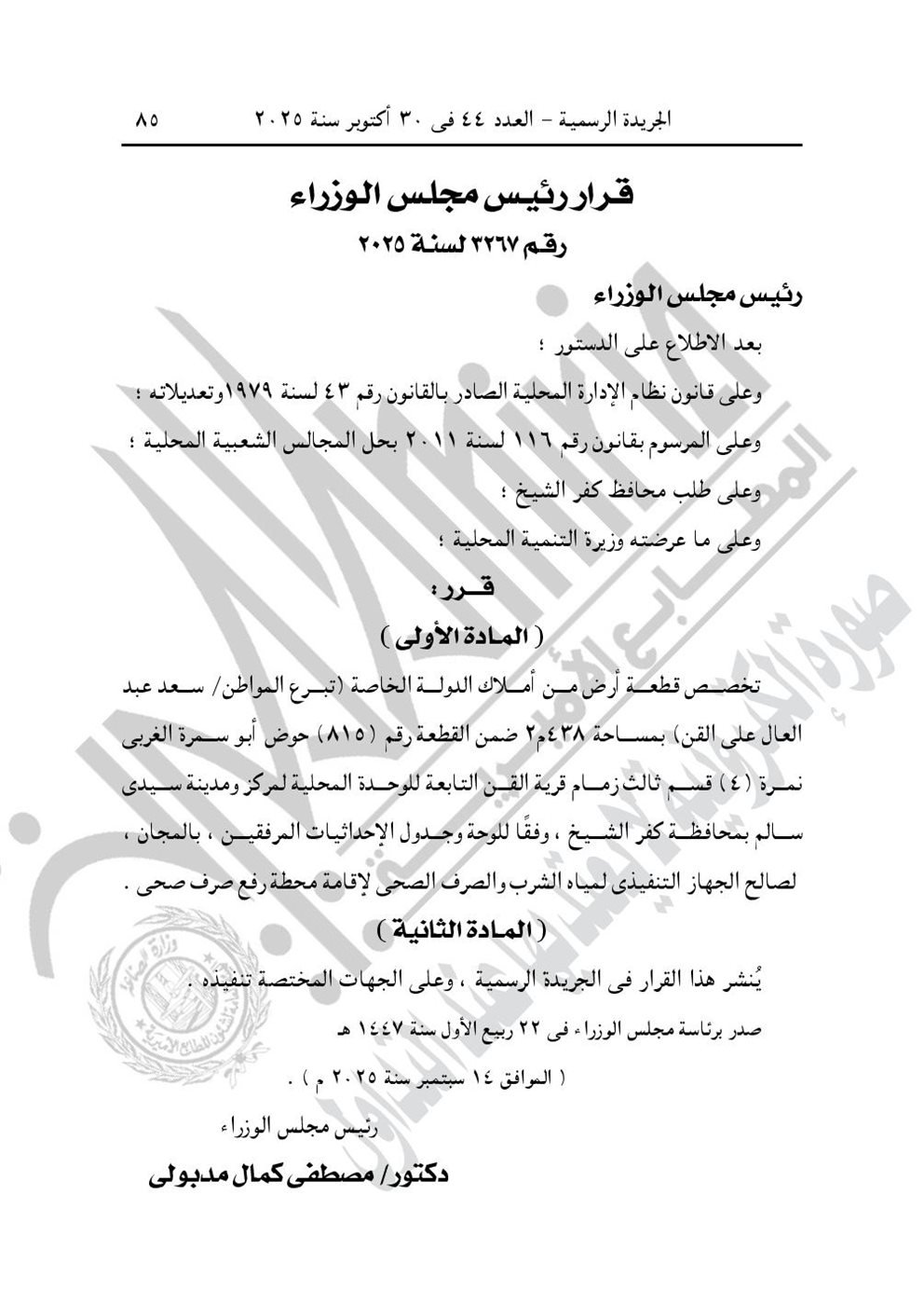 - وفي القرار الرابع رقم 3267 لسنة 2025، وافق رئيس الوزراء على تخصيص قطعة أرض بمساحة 438 مترًا مربعًا تبرع بها أحد المواطنين في قرية القن بمحافظة كفر الشيخ، لصالح الجهاز التنفيذي لمياه الشرب والصرف الصحي لإقامة محطة رفع صرف صحي تخدم المنطقة.