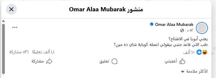 وبعد ساعات من منشوره الساخر، نشر عمر علاء مبارك تدوينة أخرى عبّر فيها عن اعتزازه وفخره بافتتاح المتحف المصري الكبير، مسترجعًا بدايات المشروع الوطني الذي وُضع حجر أساسه قبل أكثر من عقدين.
