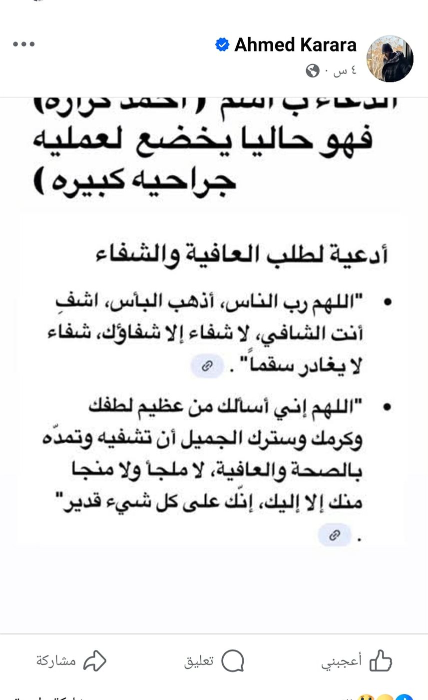 "أرجو الدعاء باسم أحمد كرارة، فهو يخضع حاليًا لعملية جراحية كبيرة".