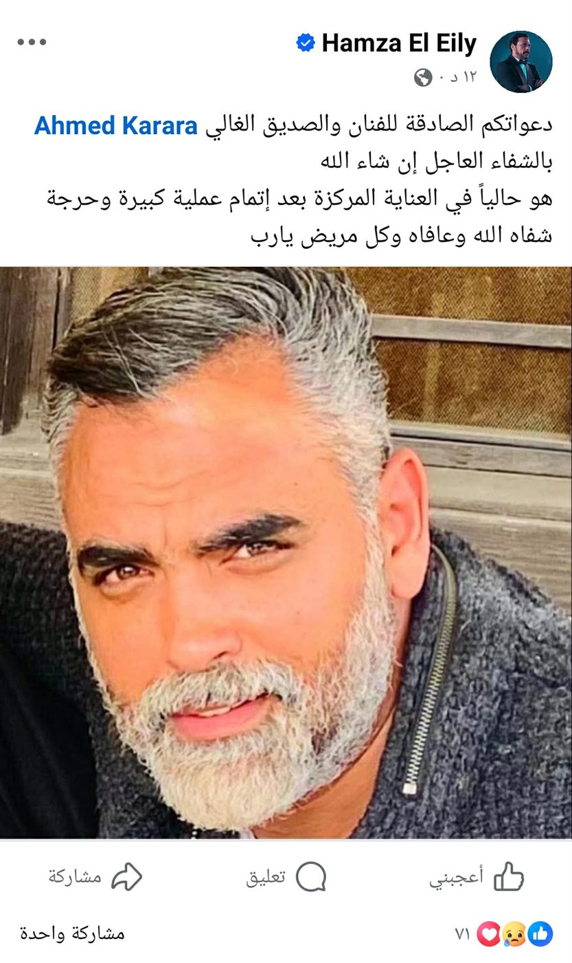 "دعواتكم الصادقة للفنان والصديق أحمد كرارة بالشفاء العاجل، هو حاليًا في العناية المركزة بعد إتمام عملية كبيرة وحرجة، شفاه الله وعافاه وكل مريض يا رب".