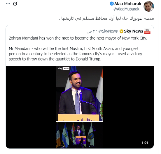 وفي هذا السياق، علق علاء مبارك، نجل الرئيس الراحل محمد حسني مبارك، على فوز ممداني عبر حسابه على منصة تويتر، قائلاً: “مدينة نيويورك جاء لها أول محافظ مسلم في تاريخها”، وذلك على حد تصريحاته.