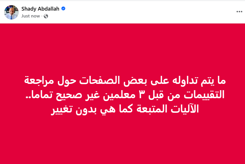 وفي أول رد رسمي، نفى شادي زلطة، المتحدث الرسمي باسم وزارة التربية والتعليم والتعليم الفني، صحة ما تم تداوله، عبر صفحته الشخصية على منصة فيسبوك، مؤكداً أن الوزارة لم تصدر أي قرارات تتعلق بمراجعة التقييمات المدرسية عبر ثلاثة معلمين، ووصف ما يتم تداوله بأنه غير صحيح تمامًا، وشدد على أن نظام التقييم المعمول به داخل المدارس مستمر كما هو، دون أي تعديلات أو تغييرات في الآليات المعتمدة.