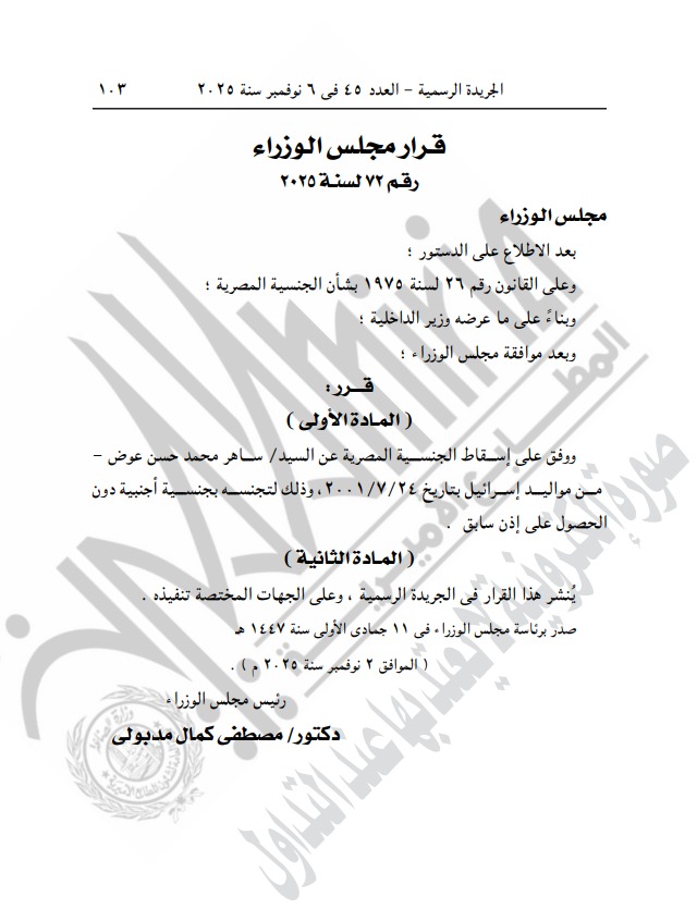 نشرت الجريدة الرسمية في عددها اليوم الخميس الموافق 6 نوفمبر، قرارا أصدره الدكتور مصطفى مدبولي، رئيس مجلس الوزراء، يقضي بإسقاط الجنسية المصرية عن المواطن ساهر محمد حسن عوض، المولود في دولة إسرائيل بتاريخ 4 يوليو 2001، وذلك بعد ثبوت تجنسه بجنسية أجنبية دون الحصول على إذن مسبق من السلطات المصرية، وفق ما تم نشره في العدد الصادر من الجريدة الرسمية.