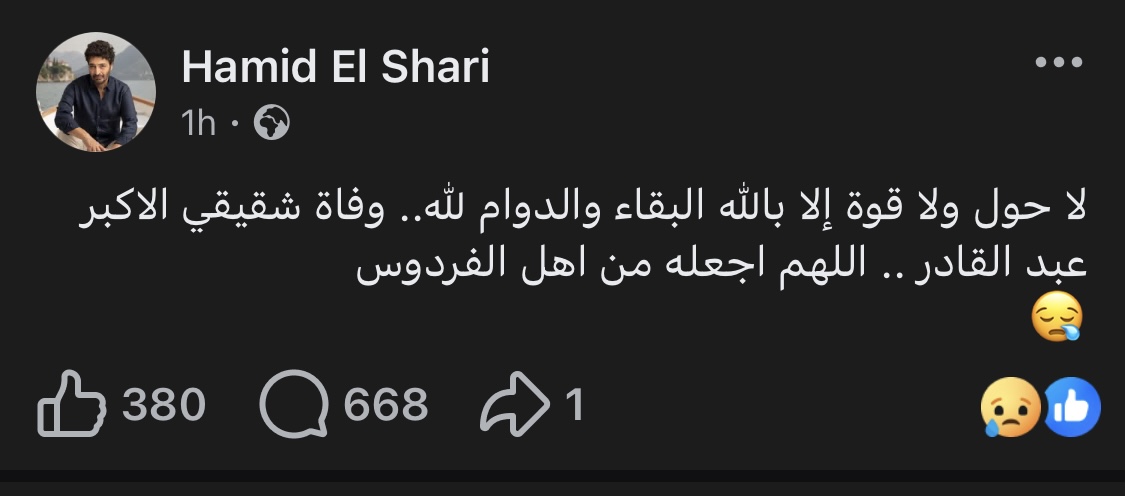 شارك الفنان حميد الشاعري جمهوره حزنه العميق بعد وفاة شقيقه الأكبر عبد القادر، حيث عبّر بكلمات مختصرة تحمل مشاعر الفقد والدعاء بالرحمة، طالبًا له مكانًا كريمًا في الجنة.