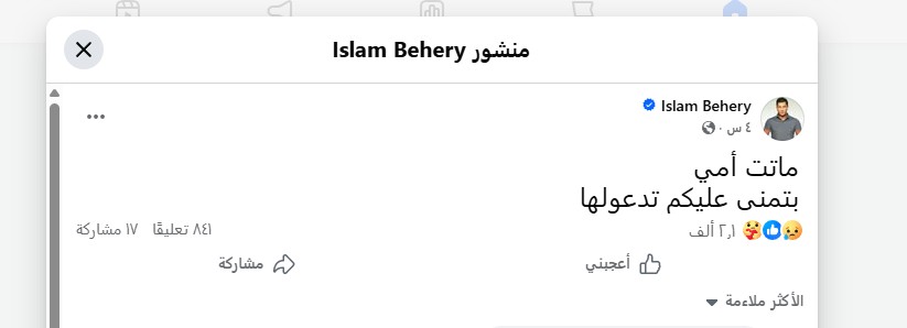 نشر إسلام بحيري منشوره المؤثر صباح اليوم، لتتلقى صفحته الرسمية مئات التعليقات التي تفاعلت مع الخبر بحزن شديد، حيث قدّم عدد كبير من متابعيه ومحبّيه التعازي له، داعين لوالدته بالرحمة ولأسرته بالصبر والسلوان.