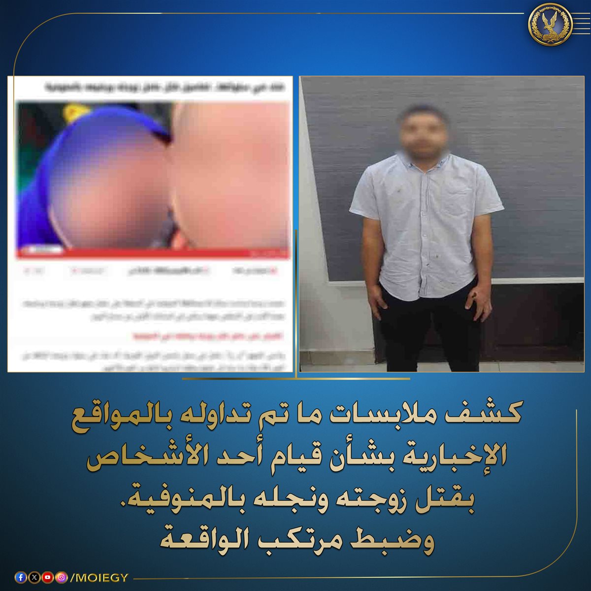 الداخلية تعلن القبض على المتهم بإنهاء حياة زوجته وطفله بقرية تلا بالمنوفية