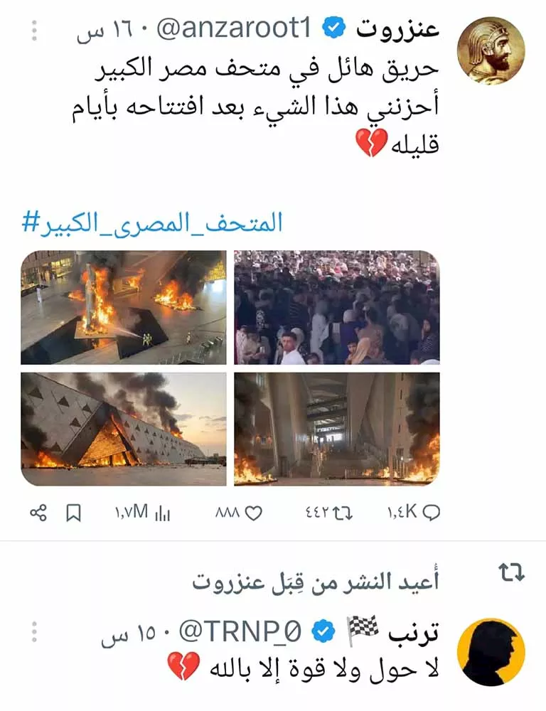 وكانت بعض الصفحات على الإنترنت قد نشرت صورًا مفبركة تحت عنوان مثير: "حريق هائل في متحف مصر الكبير. أحزنني هذا الشيء بعد افتتاحه بأيام قليلة"، وقد حظيت هذه المنشورات على ما يقرب من 1.7 مليون مشاهدة، قبل أن تتدخل الجهات الرسمية لتفنيدها والتأكيد على أن المتحف يعمل بكامل طاقته دون أي حادث.