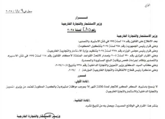 وكانت الحكومة قد أصدرت قرارًا يقضي بعدم السماح باستيراد السكر المكرر خلال الفترة المحددة، إلا في حال الحصول على موافقة رسمية بالكميات المطلوبة بعد اعتمادها من وزير التموين والتجارة الداخلية ووزير الاستثمار.