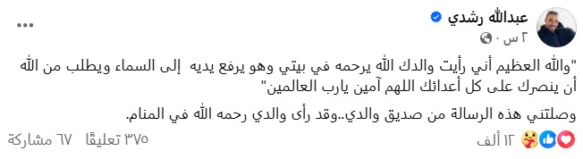 نشر الداعية عبدالله رشدي، منشورًا عبر صفحته الشخصية على منصة فيسبوك، قال فيه: "والله العظيم أني رأيت والدك الله يرحمه في بيتي وهو يرفع يديه إلى السماء ويطلب من الله أن ينصرك على كل أعدائك اللهم آمين يارب العالمين"، وتابع قائلا: "وصلتني هذه الرسالة من صديق والدي..وقد رأى والدي رحمه الله في المنام".