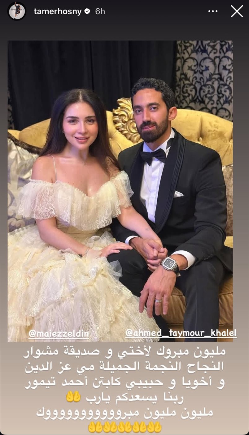 وكان من ضمن المهنئين من نجوم الوسط الفني الفنان تامر حسني، الذي وجه رسالة مؤثرة لصديقته عبر خاصية “الاستوري” على حسابه الرسمي بموقع إنستجرام، كتب فيها:“مليون مبروك لأختي وصديقة مشوار النجاح، النجمة الجميلة مي عز الدين، وأخويا وحبيبي كابتن أحمد تيمور، ربنا يسعدكم يا رب، مليون مليون مبروك.”