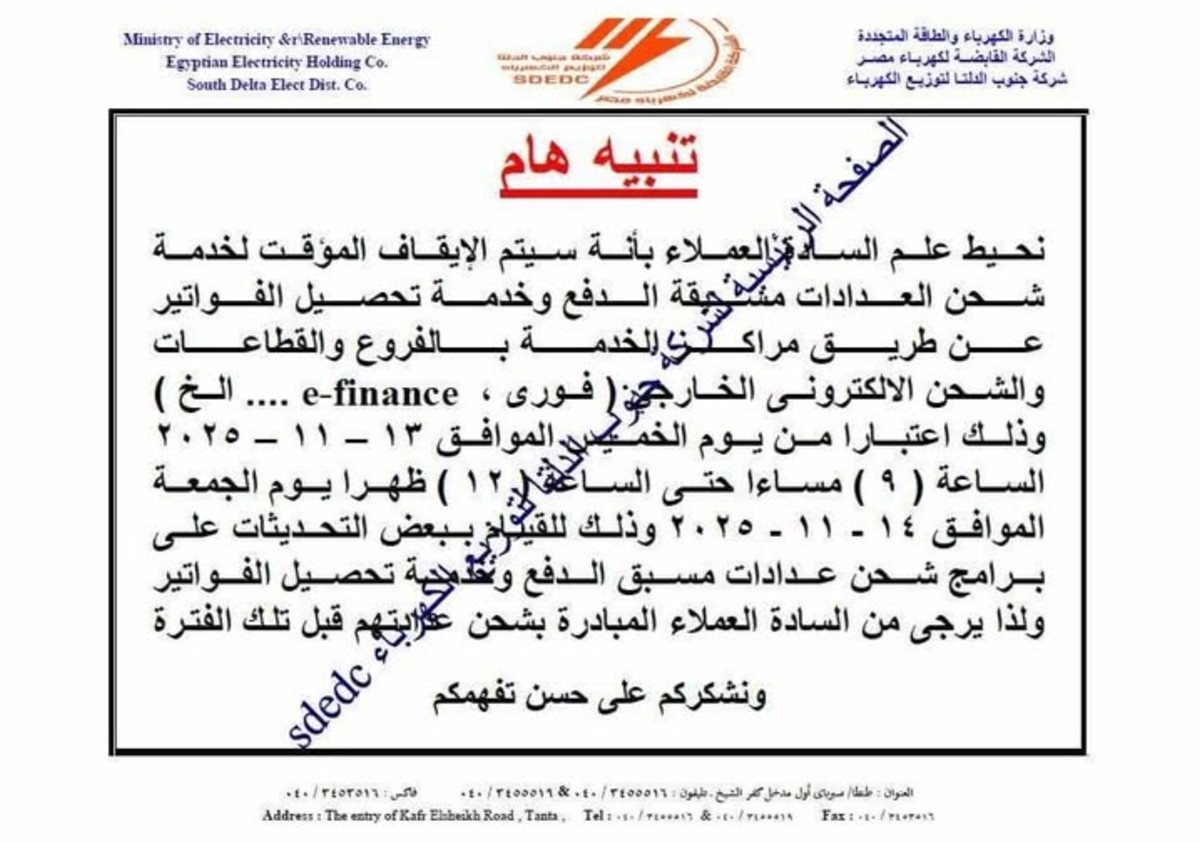 توقف مؤقت لخدمات شحن عدادات الكهرباء وتحصل الفواتير في شركة جنوب الدلتا يبدأ مساء الخميس ويستمر حتى ظهر الجمعة، في إطار خطة تحديث الأنظمة الفنية وتحسين جودة الخدمات.