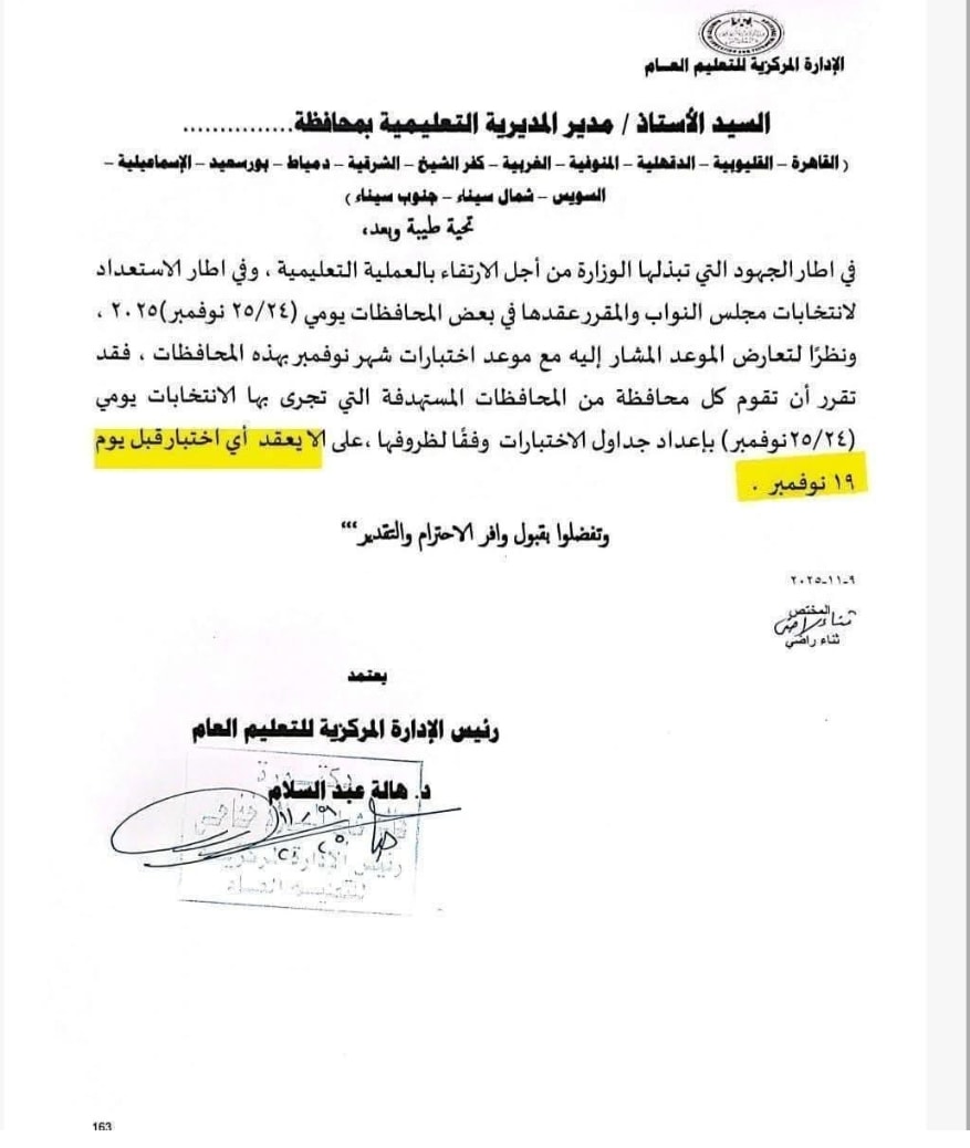 وبحسب القرار الجديد، شددت وزارة التعليم على إلا تبدأ امتحانات شهر نوفمبر في المحافظات الانتخابية قبل يوم الثلاثاء 19 نوفمبر 2025 بدلًا من الموعد السابق في 23 من الشهر نفسه، على أن تشمل المحافظات: القاهرة، القليوبية، الدقهلية، المنوفية، الغربية، كفر الشيخ، الشرقية، دمياط، بورسعيد، الإسماعيلية، السويس، شمال سيناء، وجنوب سيناء.