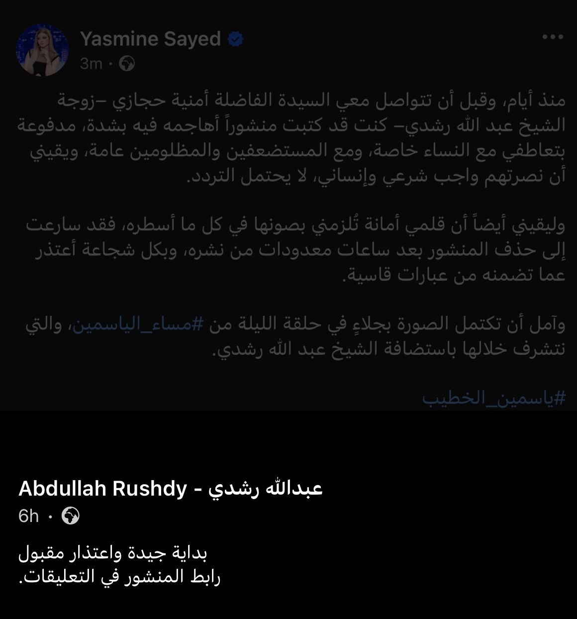 ياسمين الخطيب تعتذر لعبد الله رشدي بعد هجوم سابق والشيخ يرد باعتذار مقبول