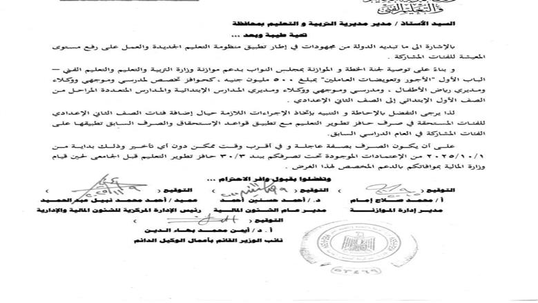 التعليم يحدد ضوابط صرف حافز تطوير التعليم 800 جنيه وحافز التدريس 1000 جنيه لجميع المعلمين
