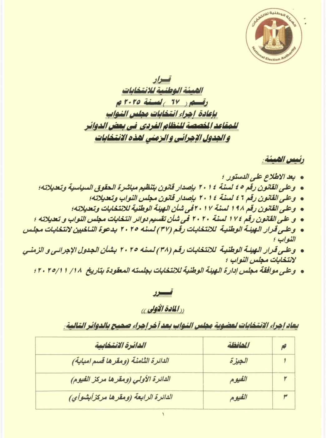 - محافظة الفيوم: دائرة مركز الفيوم إلغاء الانتخات إلغاء كليا