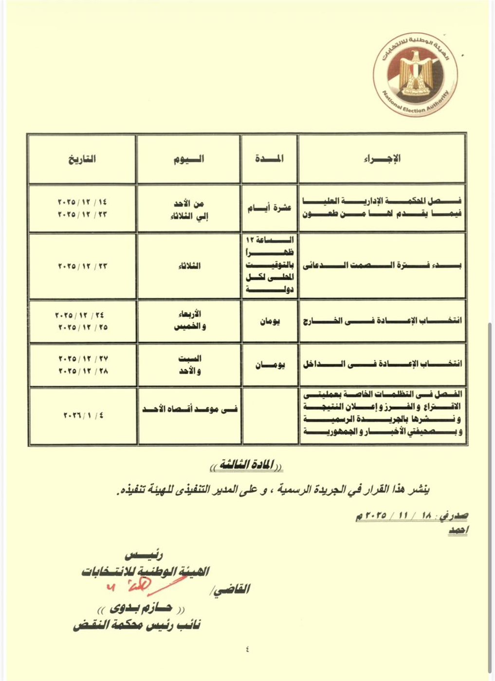 ووفقا للمؤتمر الصحفي، فقد أصدرت الهيئة قرارا رسميا بإجراء الانتخابات في الدوائر الـ19 التي تم إلغاء نتائج الانتخابات بها في الخارج يومي 1 و2 ديسمبر، وفي الداخل يومي 3 و4 في الشهر الجاري وسيتم إعلان النتيجة رسميا يوم 11 ديسمبر 2025.