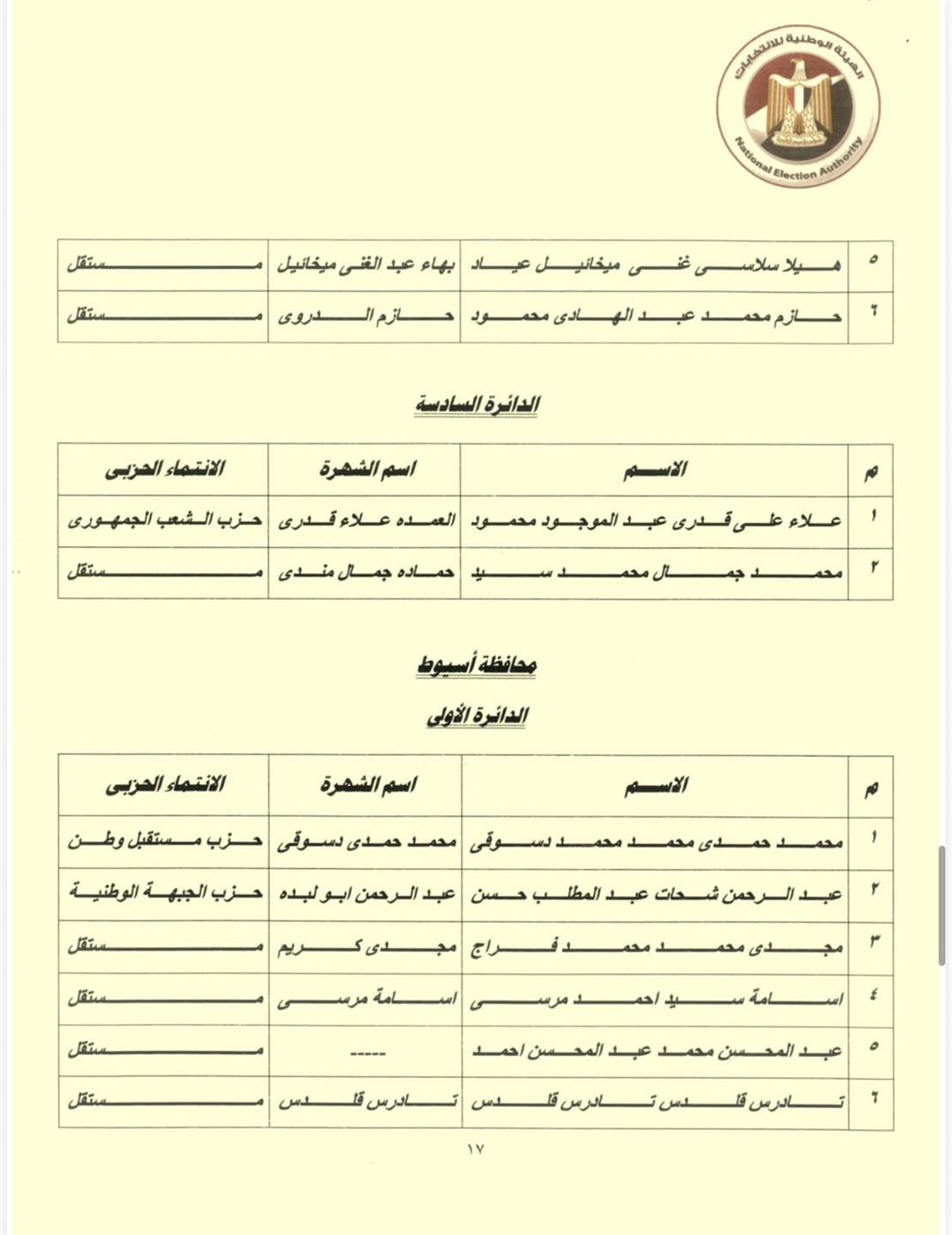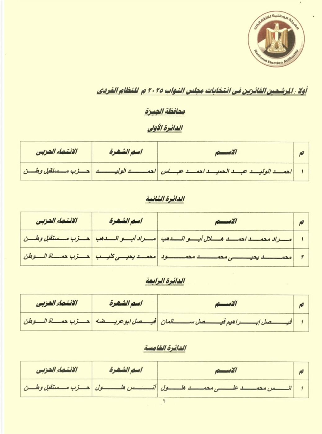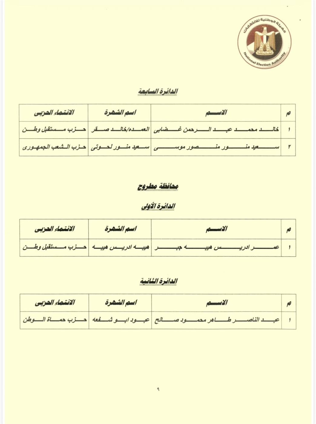ونشرت الصفحة الرسمية للهيئة الوطنية للانتخابات على منصة فيسبوك، القرار رقم 66 لسنة 2025 بشأن إعلان نتيجة الجولة الاولى من المرحلة الاولى لانتخابات مجلس النواب 2025، وجاءت أسماء الفائزين كالتالي:
