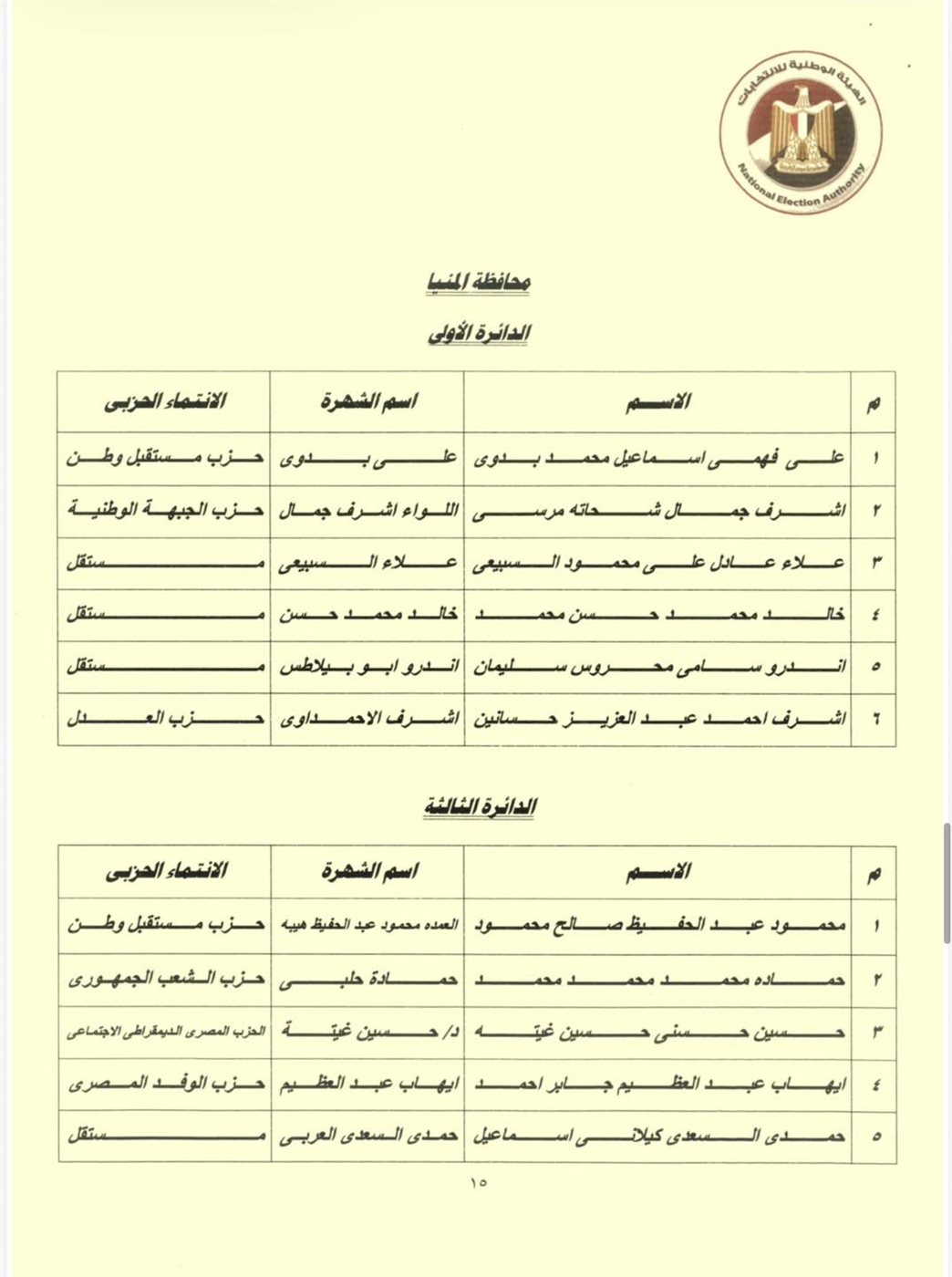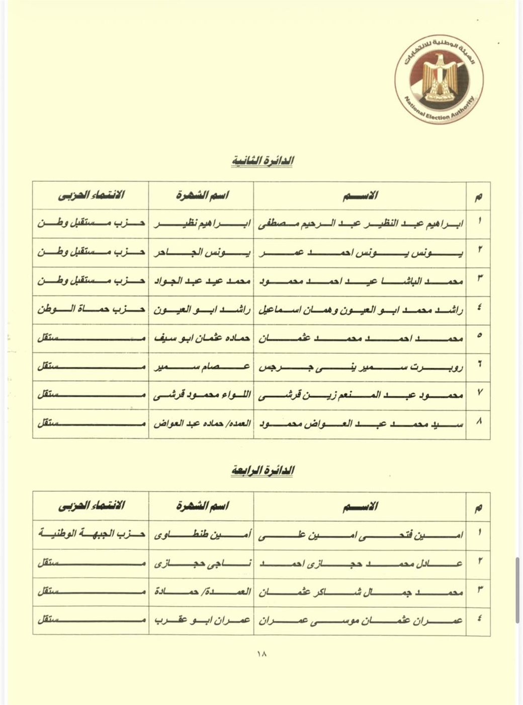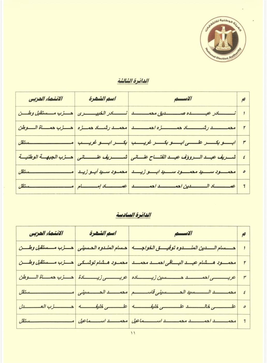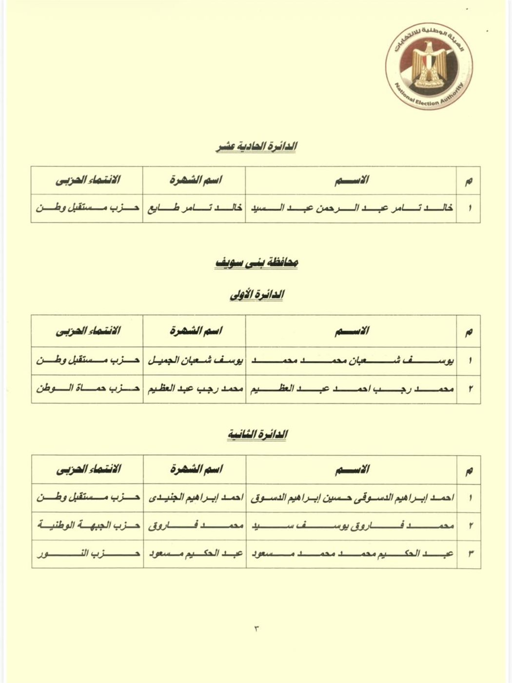 وبحسب ما أعلنه القاضي حاتم بدوي، رئيس الهيئة الوطنية للانتخابات، فقد استعرض أسماء الفائزين بالانتخابات فردي وقائمة في عدد من الدوائر بمحافظات المرحلة الاولى، كما استعرض رئيس الهيئة تفاصيل جولات الإعادة وايضا الجدول الزمني لها، وننشر لكم في السطور التالية بالصور المرفقة أسماء المرشحين الذين تم حسم مقاعدهم تحت قبة البرلمان، بالاضافة إلى ما سيحدث في جولات الإعادة.