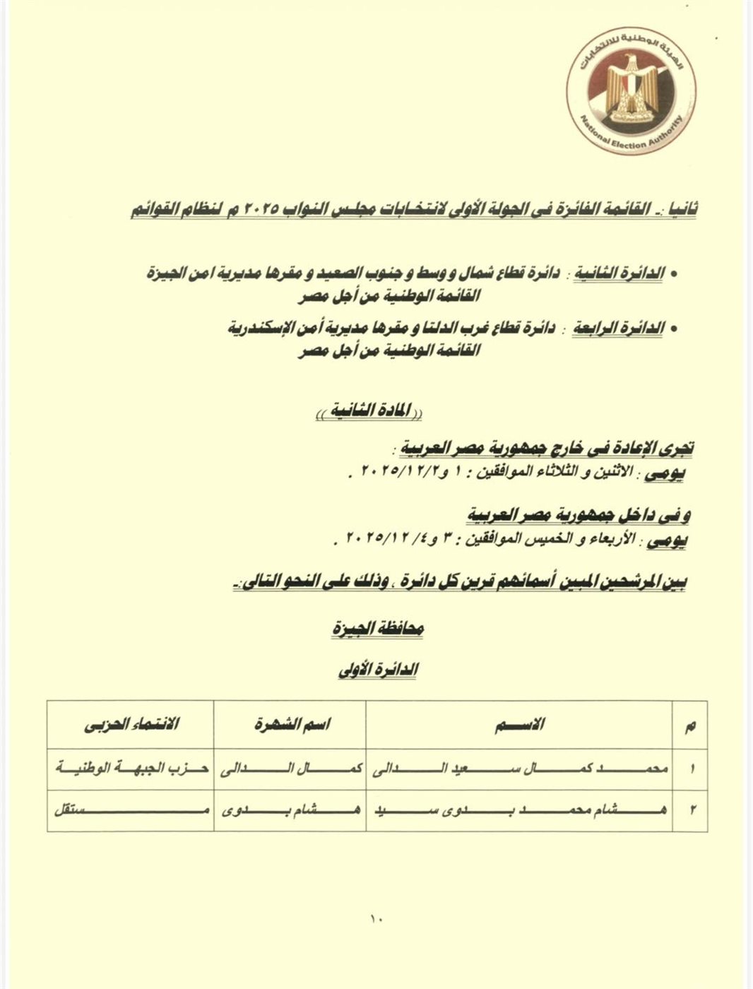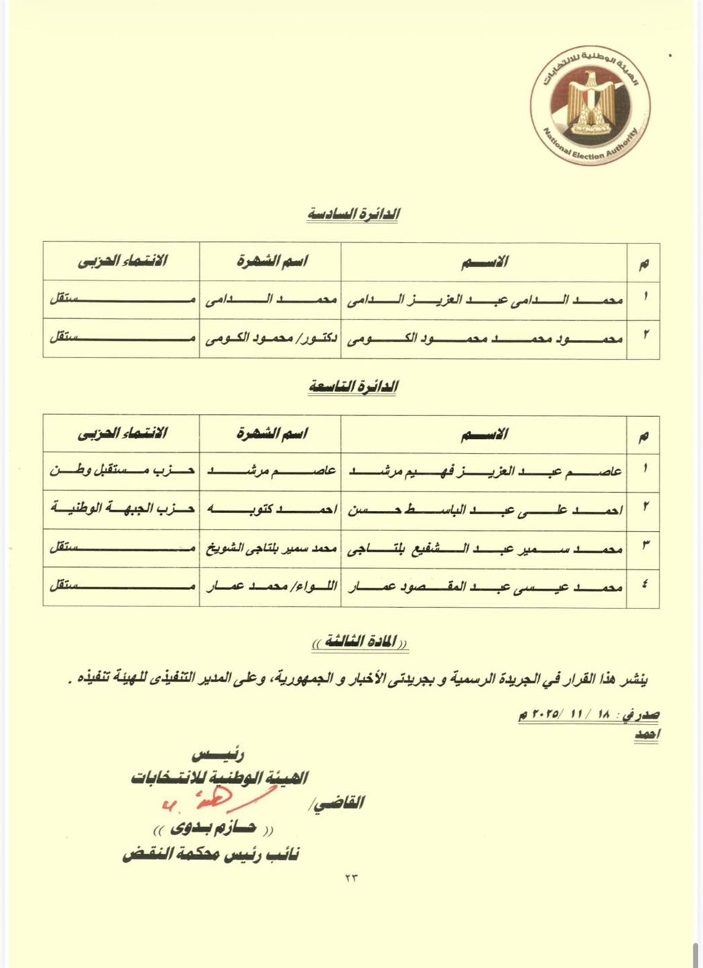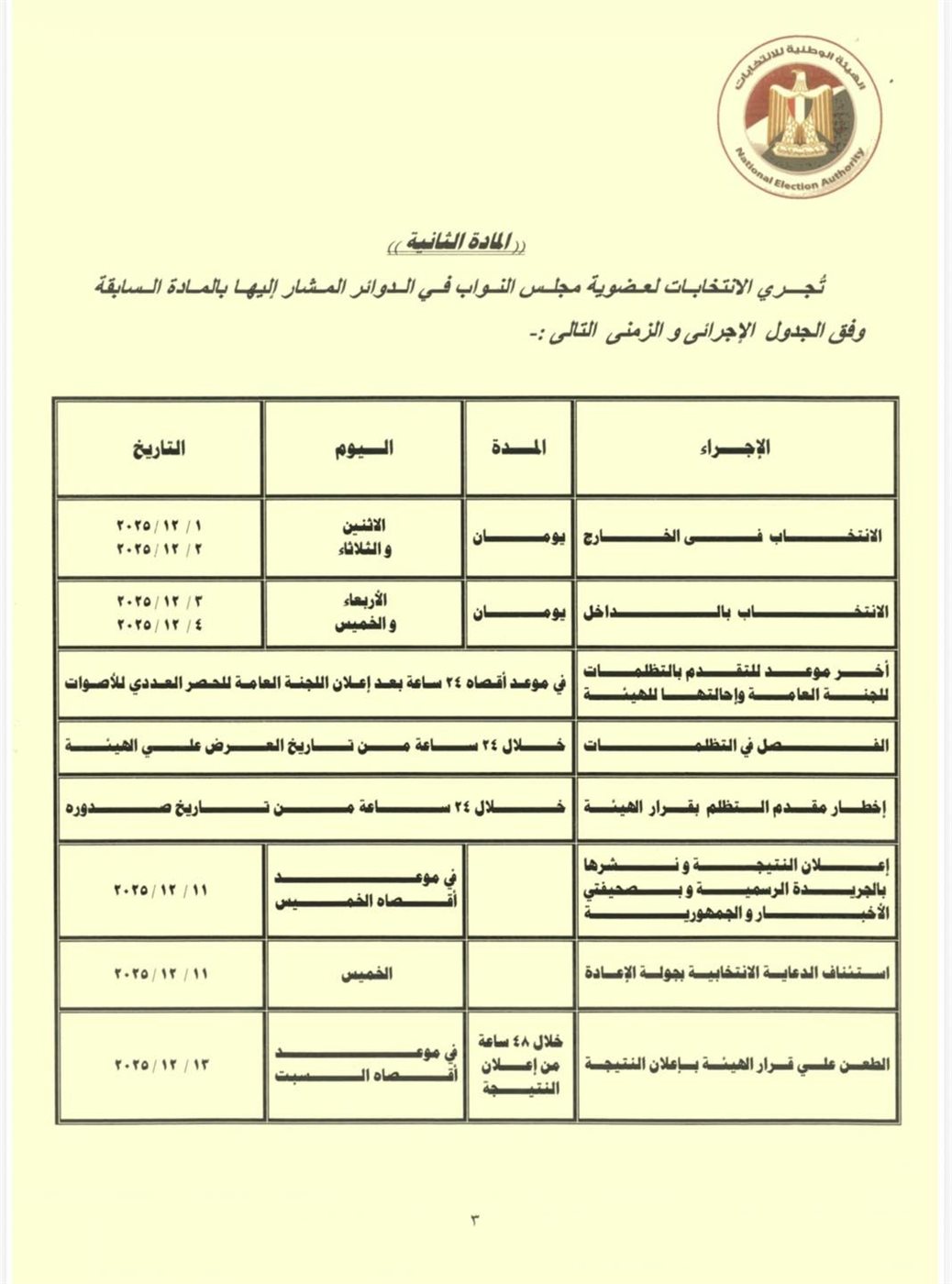 كما نشرت الهيئة الوطنية للانتخابات، القرار رقم 67 لسنة 2025 بإعادة اجراء انتخابات مجلس النواب للمقاعد المخصصة للنظام الفردى فى بعض الدوائر الانتخابية، كما أعلنت الجدول الاجرائى والزمنى لهذه الانتخابات، وجاء نص القرار كالتالي: