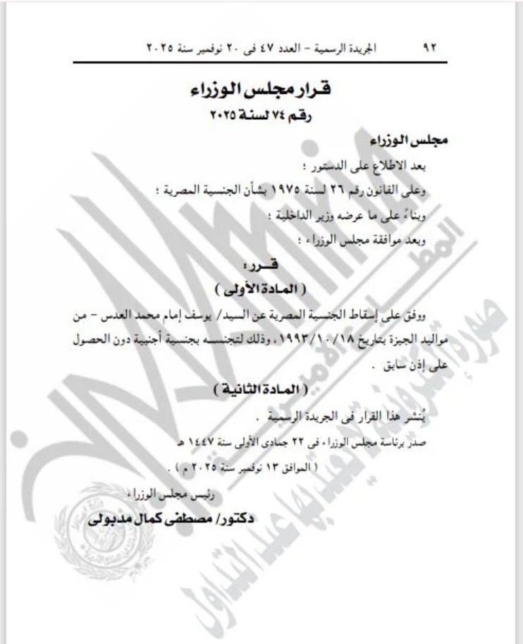 ويأتي القرار في إطار تطبيق القانون وتنظيم العلاقات القانونية الخاصة بالجنسية، بما يحافظ على الهوية الوطنية المصرية ويضمن احترام الإجراءات الدستورية.