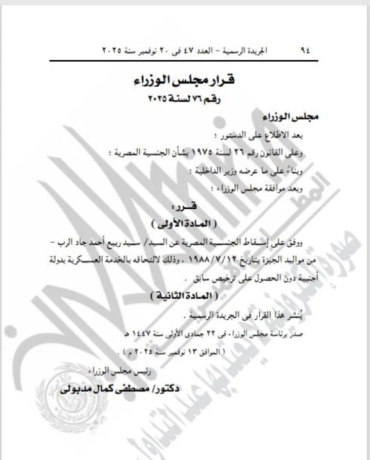 إسقاط الجنسية المصرية عن ثلاثة مواطنين، جاء بقرار رسمي أصدره الدكتور مصطفى مدبولي، رئيس مجلس الوزراء، ونُشر في الجريدة الرسمية، بعد ثبوت تجنسهم بجنسيات أجنبية دون الحصول على إذن مسبق من الجهات المختصة، وفقًا لأحكام قانون الجنسية المصرية رقم 26 لسنة 1975.