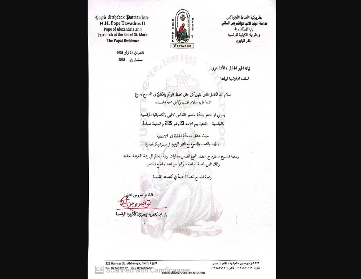 - تلقى خطابًا رسميًا من البابا يحدد موعد رسامته مطرانًا خلال قداس الأحد.