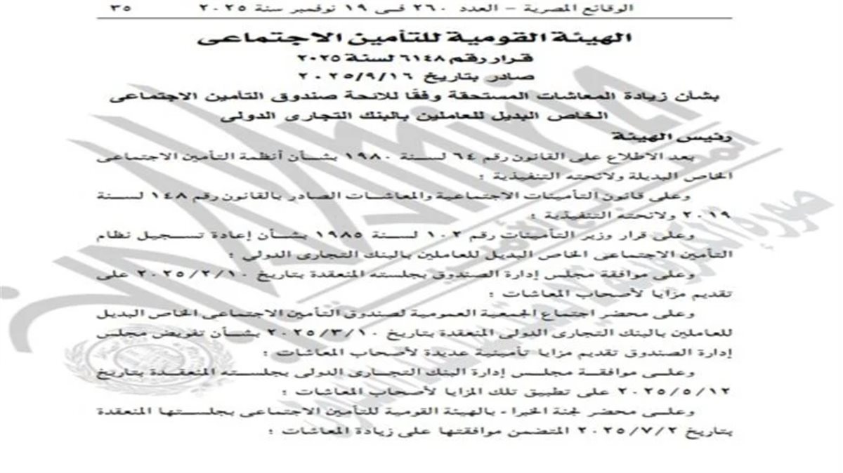 نشرت جريدة الوقائع المصرية القرار الجديد رقم 6148 لسنة 2025 في العدد الصادر بتاريخ 19 نوفمبر 2025، والذي كشف تفاصيل زيادة المعاشات للفئات المستفيدة.