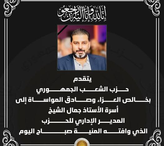 تقدّم الحزب بخالص المواساة إلى أسرة الفقيد، داعيًا الله أن يتغمده بواسع رحمته، مؤكدًا أن أثر وفاة جمال الشيخ تجاوز حدود العمل التنظيمي إلى علاقات إنسانية امتدت لسنوات بينه وبين كوادر الحزب في مختلف المحافظات.